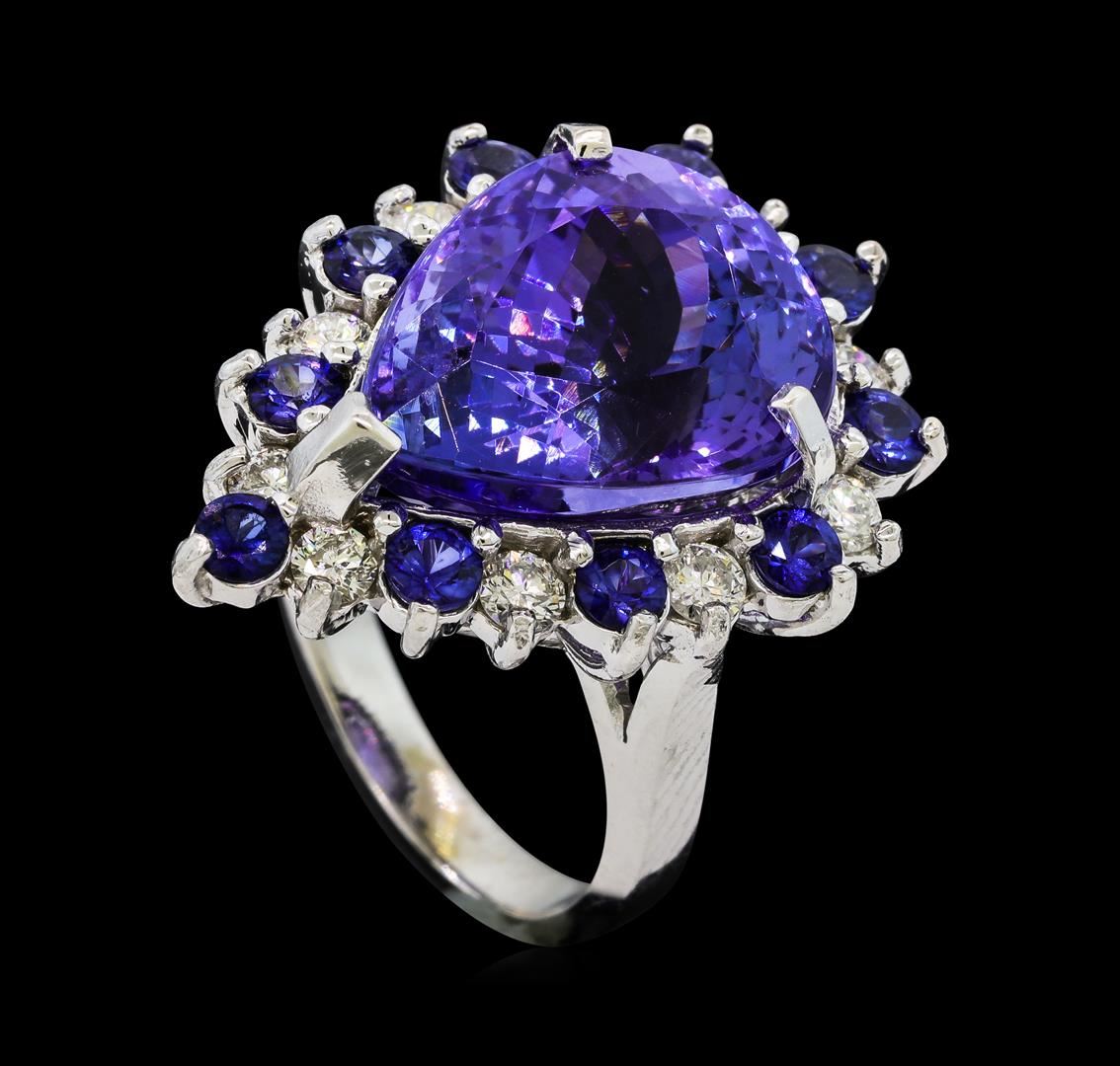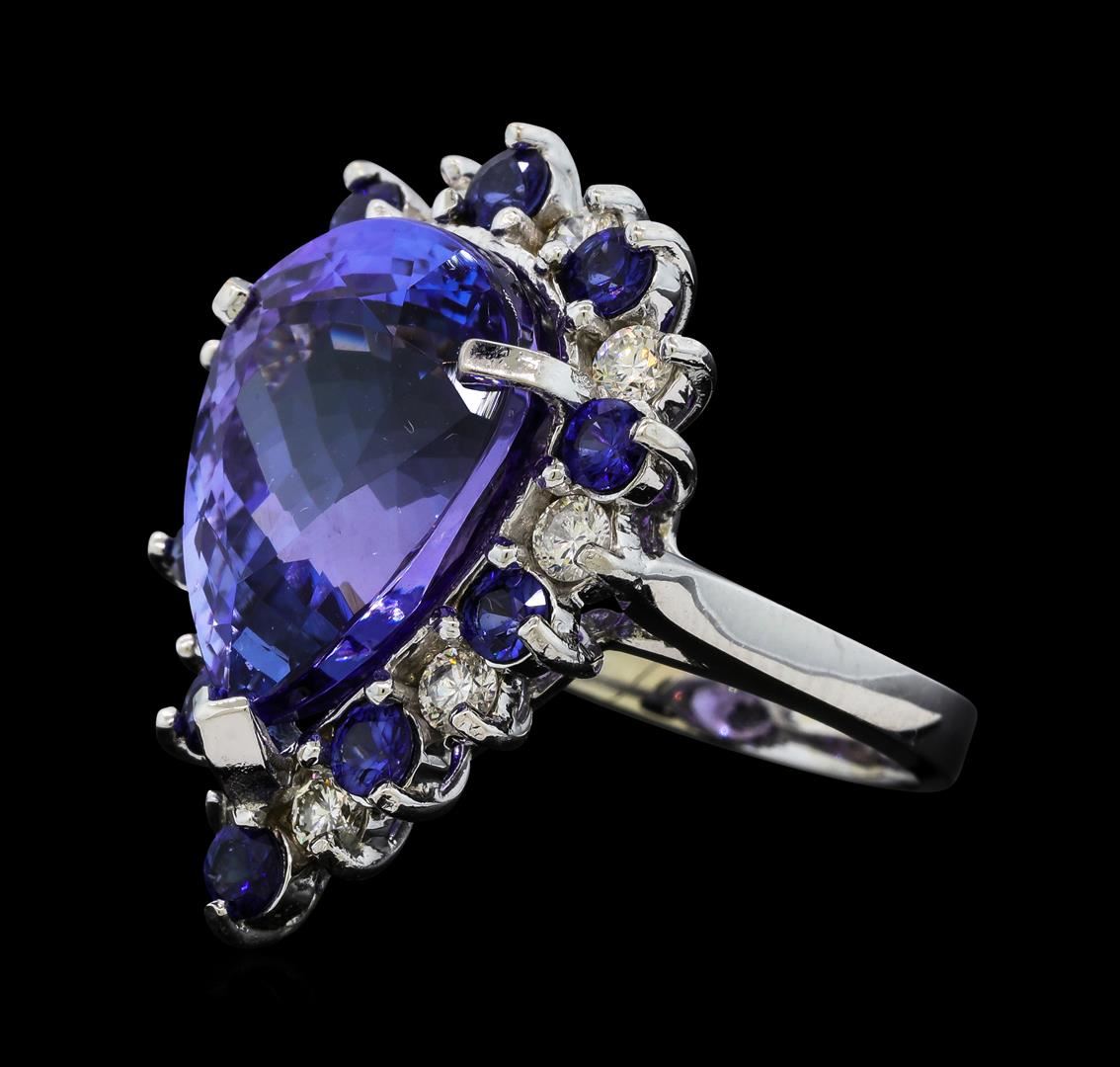 One electronically tested 14KT white gold lady's cast fashion ring with a staggered basket halo with a bright polish finish. The featured lady's ring has a shank measuring 2.80 millimeters wide. Identified with markings of 'K14'. Condition is new, good workmanship. Containing: One prong set pear modified brilliant cut natural tanzanite, measuring 16.62 x 13.35 x 10.82mm, (depth est.) approximate weight of 16.06ct., clarity is eye clean, medium, moderately strong, violetish blue color, (GIA vB 5/4), cut is very good. Transmitting light with no distortion, transparent. Colored gemstones are presumed to have been subjected to commonly used enhancement processes. Graded in the setting. Ten prong set round modified brilliant cut natural blue sapphires, measuring 2.90 - 2.80 x 1.86 mm, (depth est.) approximate total weight of 1.22ct., clarity is eye clean, medium, strong, blue color, (GIA B 5/5), cut is good. Transmitting light with no distortion, transparent. Colored gemstones are presumed to have been subjected to commonly used enhancement processes. Graded in the setting. Ten prong set round brilliant cut diamonds, measuring 2.75 - 2.65 x 1.67mm (depth est.) approximate total weight of 10 Stones = 0.75ct. Graded in the setting. Clarity SI-1 to SI-3. Color: H - I Cut Good. Total Weight of Colored Stones 17.28ct.. Total Weight of Diamonds 0.75ct.. Total Weight of Ring 10.60gm. GAS Appraised at $22,200.00.