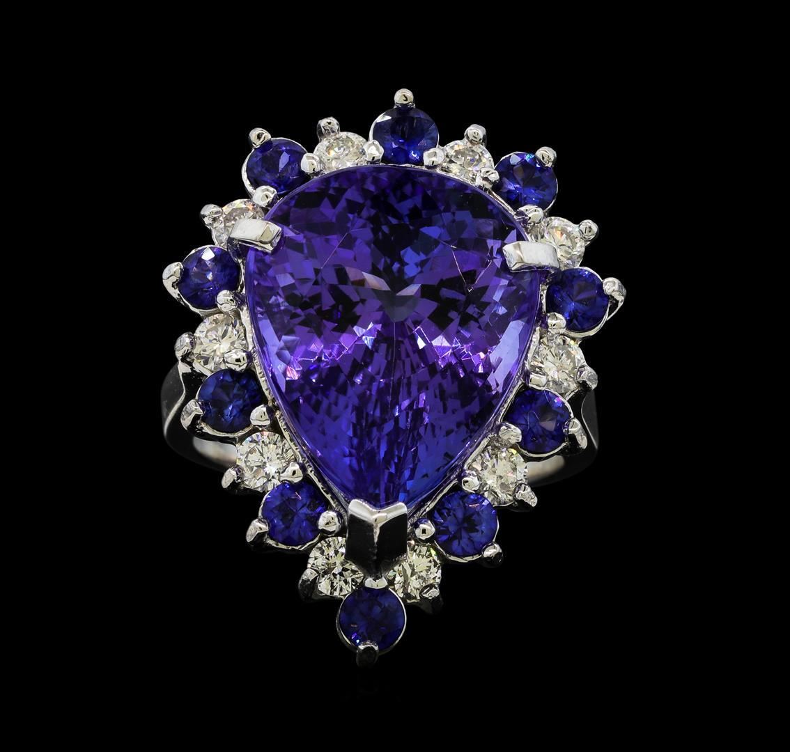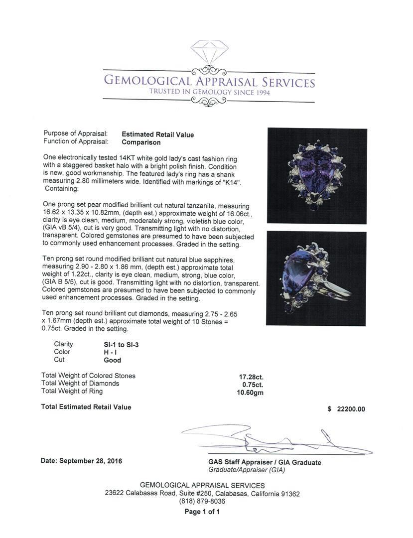 One electronically tested 14KT white gold lady's cast fashion ring with a staggered basket halo with a bright polish finish. The featured lady's ring has a shank measuring 2.80 millimeters wide. Identified with markings of 'K14'. Condition is new, good workmanship. Containing: One prong set pear modified brilliant cut natural tanzanite, measuring 16.62 x 13.35 x 10.82mm, (depth est.) approximate weight of 16.06ct., clarity is eye clean, medium, moderately strong, violetish blue color, (GIA vB 5/4), cut is very good. Transmitting light with no distortion, transparent. Colored gemstones are presumed to have been subjected to commonly used enhancement processes. Graded in the setting. Ten prong set round modified brilliant cut natural blue sapphires, measuring 2.90 - 2.80 x 1.86 mm, (depth est.) approximate total weight of 1.22ct., clarity is eye clean, medium, strong, blue color, (GIA B 5/5), cut is good. Transmitting light with no distortion, transparent. Colored gemstones are presumed to have been subjected to commonly used enhancement processes. Graded in the setting. Ten prong set round brilliant cut diamonds, measuring 2.75 - 2.65 x 1.67mm (depth est.) approximate total weight of 10 Stones = 0.75ct. Graded in the setting. Clarity SI-1 to SI-3. Color: H - I Cut Good. Total Weight of Colored Stones 17.28ct.. Total Weight of Diamonds 0.75ct.. Total Weight of Ring 10.60gm. GAS Appraised.