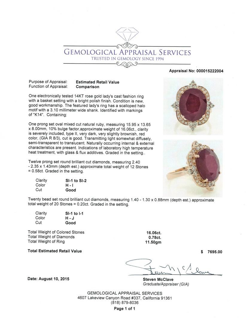 One electronically tested 14KT rose gold lady's cast fashion ring with a basket setting with a bright polish finish. The featured lady's ring has a scalloped halo motif with a 3.10 millimeter wide shank. Identified with markings of "K14". Condition is new, good workmanship. Containing: One prong set oval mixed cut natural ruby, measuring 15.95 x 13.65 x 8.00mm, 10% bulge factor, approximate weight of 16.06ct., clarity is severely included, type II, very dark, very slightly brownish, red color, (GIA R 8/3), cut is good. Transmitting light somewhat diffusely, semi-transparent to translucent. Naturally occurring internal & external characteristics are present. Indications of laboratory high temperature heat treatment, with glass & flux additives. Graded in the setting. Twelve prong set round brilliant cut diamonds, measuring 2.40 - 2.35 x 1.43mm (depth est.) approximate total weight of 12 Stones = 0.58ct. Graded in the setting. Clarity: SI-1 to SI-2. Color: H - I. Cut Good Twenty bead set round brilliant cut diamonds, measuring 1.40 - 1.30 x 0.88mm (depth est.) approximate total weight of 20 Stones = 0.20ct. Graded in the setting. Clarity: SI-1 to I-1. Color: H - J. Cut Good. Total Weight of Colored Stones 16.06ct. Total Weight of Diamonds 0.78ct. Total Weight of Ring 11.50gm. GAS Appraised at $7,695.00.