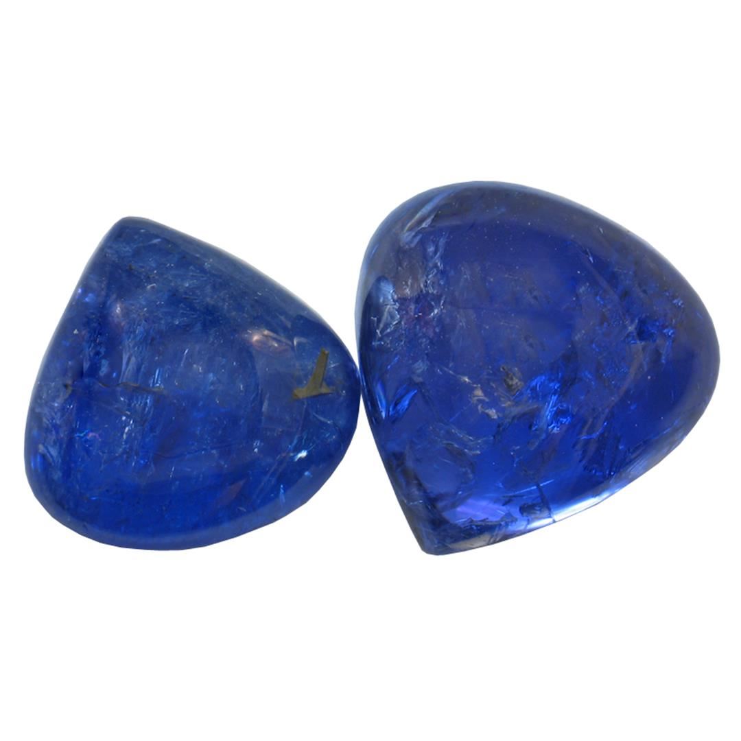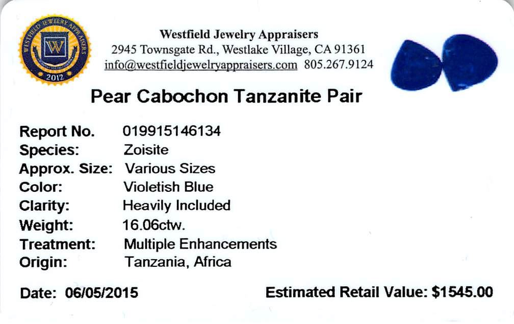 Two pear cabochon cut natural tanzanites exact total weight 16.06ct., clarity is heavily included, type I, dark, moderately strong, violetish blue color, (GIA vB 7/4), cut is good. Transmitting light somewhat diffusely, transparent to translucent. Naturally occurring internal & external characteristics are present. Color grade is an average for the pair. Tanzanite is a very rare gemstone that is only found in the country of Tanzania. Originally discovered in 1967. Tiffany & Company, named the stone Tanzanite. It is found in the Usumburu Mountains that border the Umba Valley of northern Tanzania. Tanzanite occurs in gray, brown, violet, blue, reddish-purple, & green. The gem is interesting because of its exceptional pleochroism. Rotated in different directions a tanzanite will exhibit multiple changes of color. Tanzanite has a low tolerance to ultrasonic cleaning, and should not be cleaned using this method. Westfield Appraised at $1,545.00.