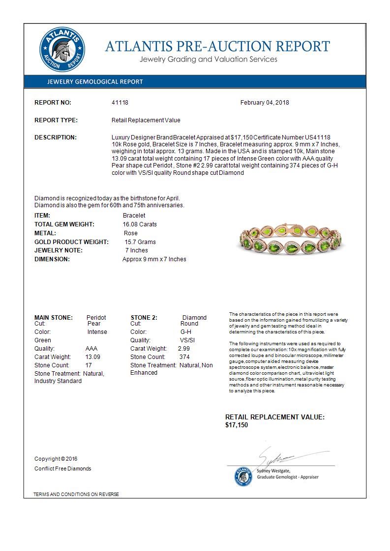 REF-312F2N -41118 ---- 16.08 CTW Peridot & Diamond Halo Bracelet 10K Rose Gold ---- Luxury Designer Brand Bracelet Appraised at $17,150 Certificate Number US41118 10k Rose gold, Bracelet Size is 7 Inches, Bracelet measuring approx. 9 mm x 7 Inches, weighing in total approx. 13 grams. Made in the USA and is stamped 10k, Main stone 13.09 carat total weight containing 17 pieces of Intense Green color with AAA quality Pear shape cut Peridot , Stone #2 2.99 carat total weight containing 374 pieces of G-H color with VS/SI quality Round shape cut Diamond