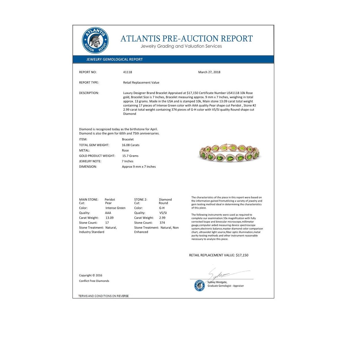 REF-312F2N -41118 ---- 16.08 CTW Peridot & Diamond Halo Bracelet 10K Rose Gold ---- Luxury Designer Brand Bracelet Appraised at $17,150 Certificate Number US41118 10k Rose gold, Bracelet Size is 7 Inches, Bracelet measuring approx. 9 mm x 7 Inches, weighing in total approx. 13 grams. Made in the USA and is stamped 10k, Main stone 13.09 carat total weight containing 17 pieces of Intense Green color with AAA quality Pear shape cut Peridot , Stone #2 2.99 carat total weight containing 374 pieces of G-H color with VS/SI quality Round shape cut Diamond