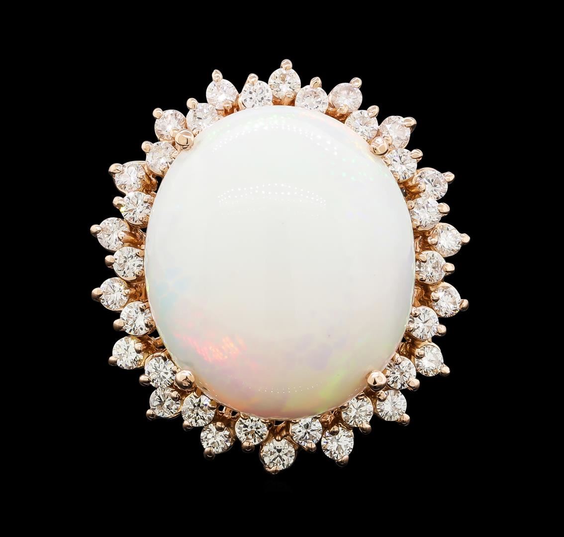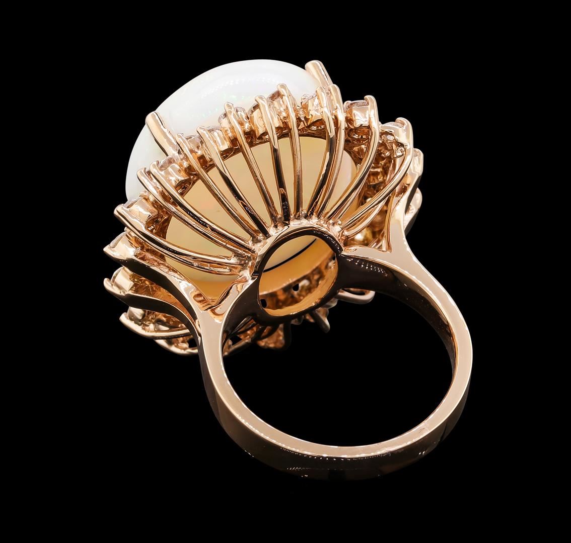 One electronically tested 14KT rose gold lady's cast fashion ring with a staggered basket halo with a bright polish finish. The featured lady's ring has a shank measuring 3.17 millimeters wide. Identified with markings of 'K14'. Condition is new, good workmanship. Containing: One crystal opal that is cut in a oval shaped cabochon and is prong set, measuring 21.80 mm long x 18.83 mm wide, and 10.09 mm thick and the approximate weight is 16.08 carats. The opal has a somewhat bright, multicolor play of color (fire) in a rolling flashfire pattern; a medium dome; a good cut; no inclusions; major dull spot in its brightness and pattern; and is not directional. Graded in the setting. Thirty-Six prong set round brilliant cut diamonds, measuring 2.25 - 2.15 x 1.36mm (depth est.) approximate total weight of 36 Stones = 1.47ct. Graded in the setting. Clarity SI-1 to SI-2. Color: H - I Cut Good. Total Weight of Diamonds 1.47ct.. Total Weight of Opals 16.08ct.. Total Weight of Ring 15.20gm. GAS Appraised at $7,150.00.