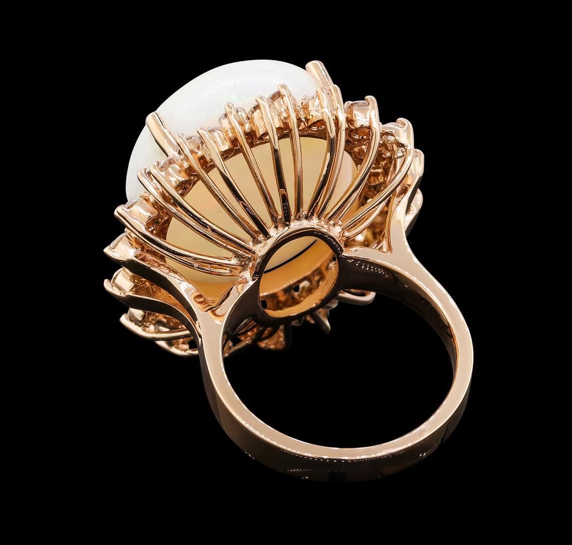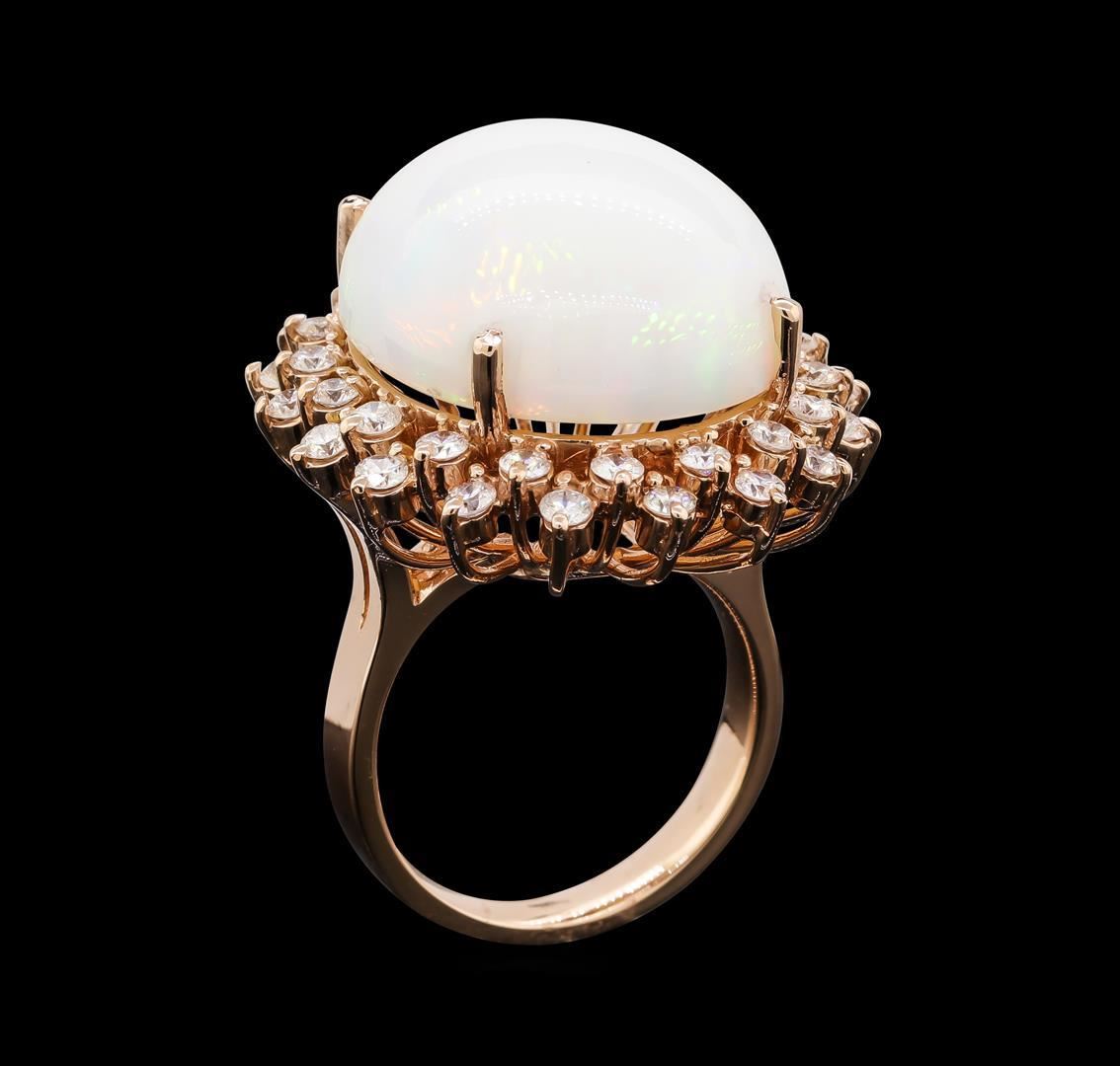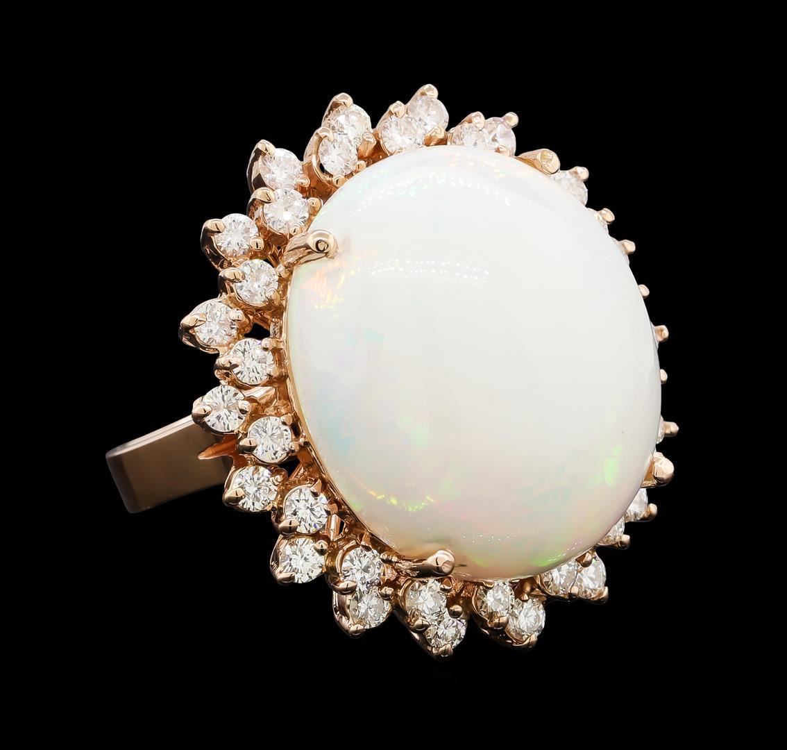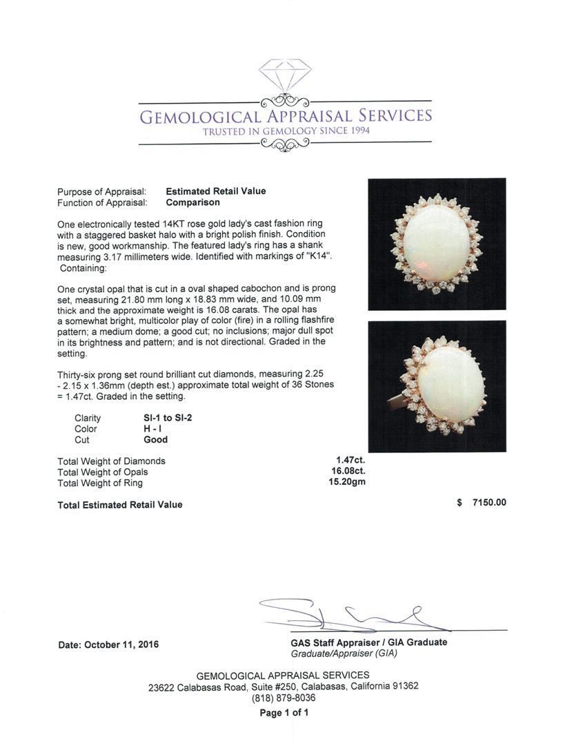 One electronically tested 14KT rose gold lady's cast fashion ring with a staggered basket halo with a bright polish finish. The featured lady's ring has a shank measuring 3.17 millimeters wide. Identified with markings of 'K14'. Condition is new, good workmanship. Containing: One crystal opal that is cut in a oval shaped cabochon and is prong set, measuring 21.80 mm long x 18.83 mm wide, and 10.09 mm thick and the approximate weight is 16.08 carats. The opal has a somewhat bright, multicolor play of color (fire) in a rolling flashfire pattern; a medium dome; a good cut; no inclusions; major dull spot in its brightness and pattern; and is not directional. Graded in the setting. Thirty-Six prong set round brilliant cut diamonds, measuring 2.25 - 2.15 x 1.36mm (depth est.) approximate total weight of 36 Stones = 1.47ct. Graded in the setting. Clarity SI-1 to SI-2. Color: H - I Cut Good. Total Weight of Diamonds 1.47ct.. Total Weight of Opals 16.08ct.. Total Weight of Ring 15.20gm. GAS Appraised.