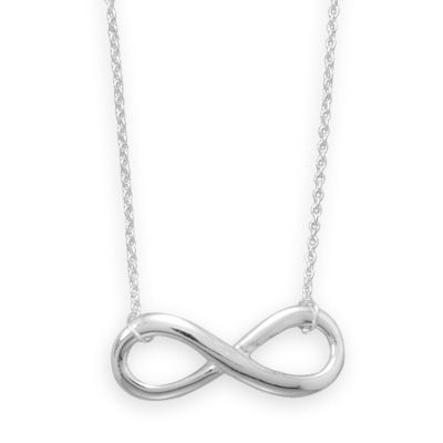 16" + 1" + 1" extension sterling silver necklace with a polished 6mm x 20mm infinity design drop. This necklace has a lobster clasp closure. .925 Sterling Silver