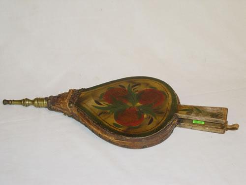 16 1/2" 19TH CENT. PAINT DECORATED WOODEN FIREPLACE BELLOWS W/ BRASS NOZZLE-3 RED & ORANGE FRUITS W/ GREEN LEAVES & GREEN BORDER W/ SMOKE DECORATED BACKGROUND - WEAR & IMPERFECTIONS, LOSS TO LEATHER & PAINT