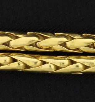 In 18K yellow gold the chain is a very unique foxtail design and has a lobster clasp. The chain is 3.3mm thick. 31.7g