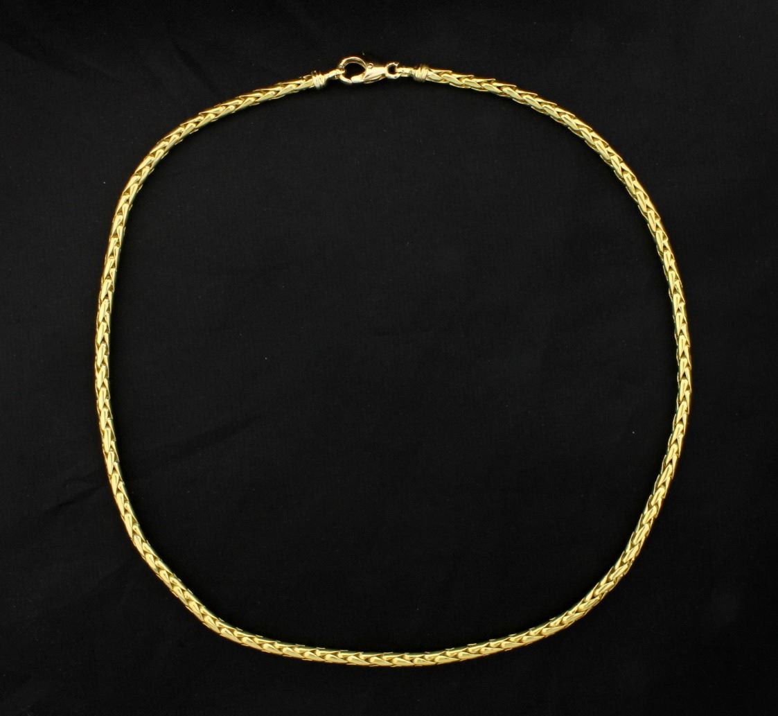 In 18K yellow gold the chain is a very unique foxtail design and has a lobster clasp. The chain is 3.3mm thick. 31.7g