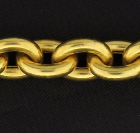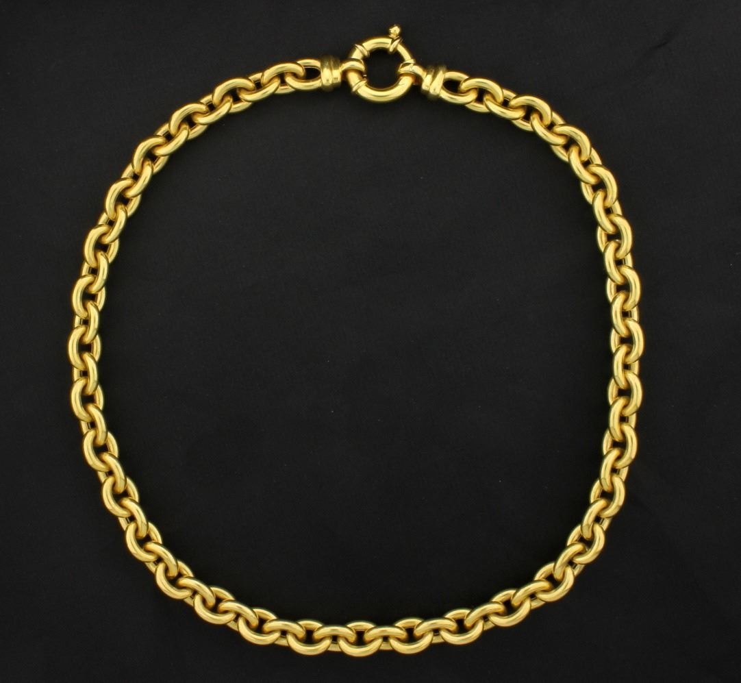 This chain is 14K yellow gold and is 8.7mm thick. It has a very large clasp. 33.5g