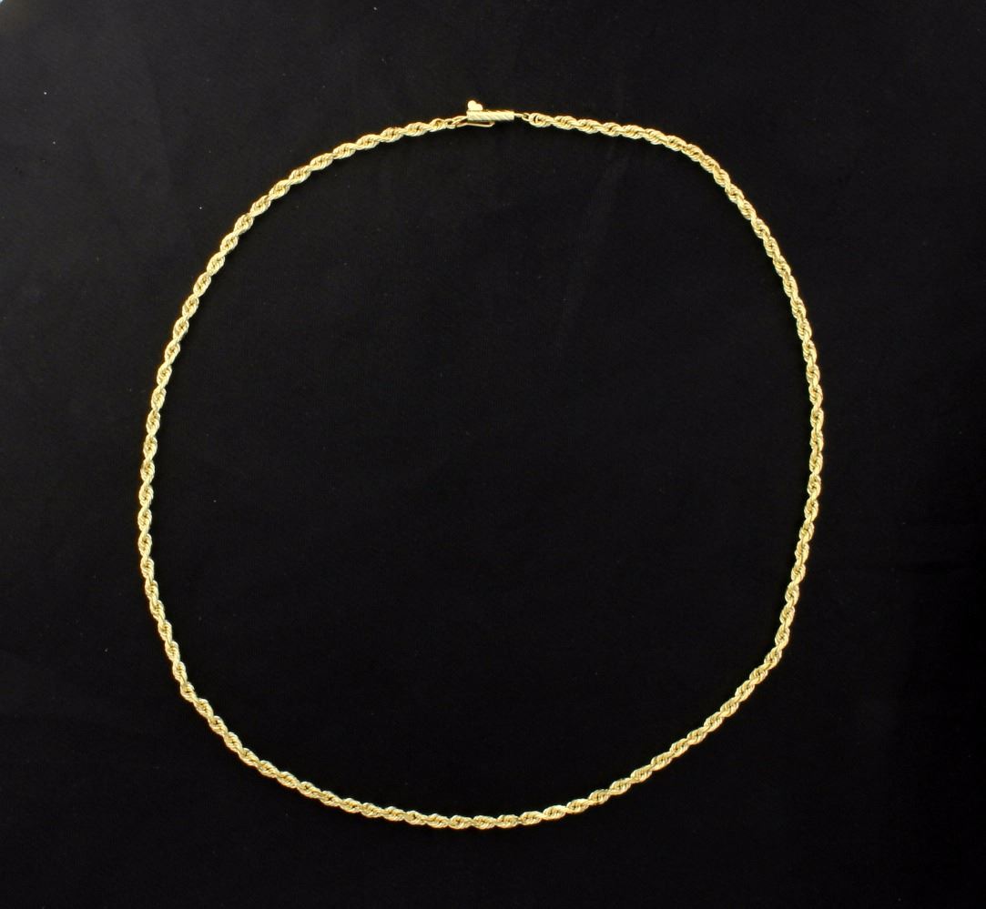 In 14K yellow gold this chain is 2.2mm wide and has a safety clasp. 8.3g