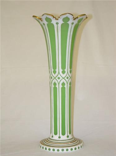 16 1/4" SANDWICH CUT OVERLAY VASE W/ FLARED TOP-WHITE CUT TO GREEN HIGHLIGHTED IN GOLD - GOLD WEAR & IMPERFECTION TO GREEN GLASS
