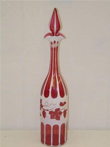 16 1/4" SANDWICH WHITE CUT TO CRANBERRY DECANTER W/ VINTAGE PATTERN - BUBBLE BURST ON STOPPER, CONTENT STAIN