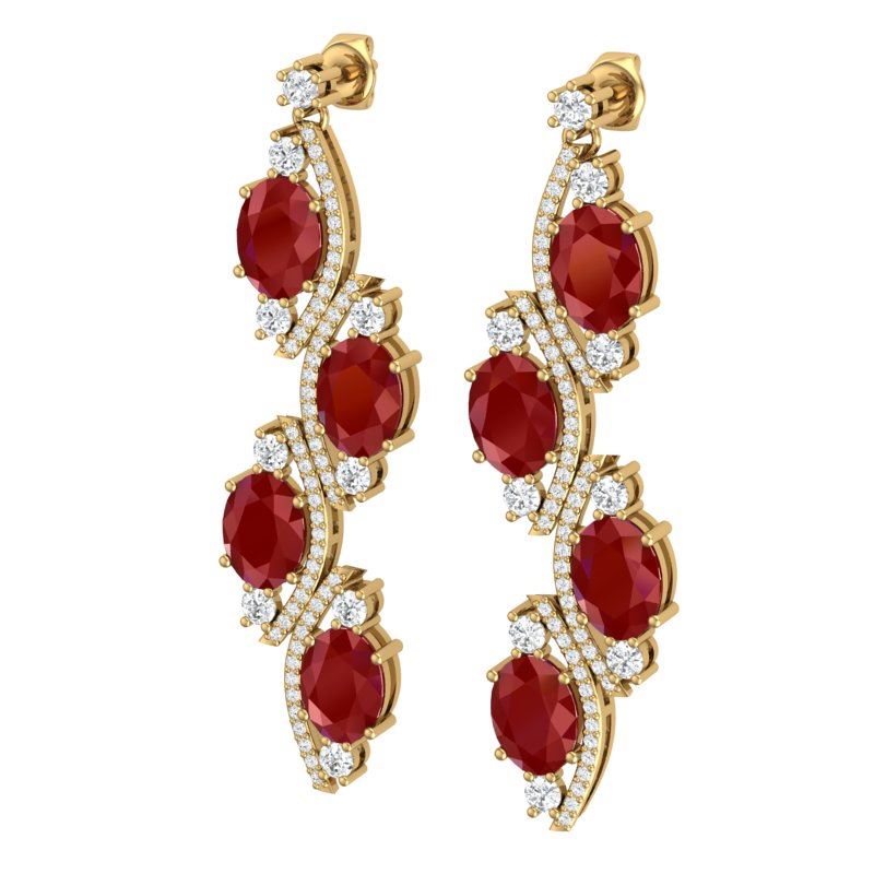 16.12 CTW Royalty Designer Ruby & VS Diamond Earrings 18K Yellow Gold ---- Luxury Designer Brand Earring Appraised Retail Price at $25,600 ---- SKU Number US38981 18K Yellow gold Earring Size is 50 Millimeter long, Earring measuring approx. 2 x 3/4 Inches, weighing in total approx. 11 grams. Made in the USA and is stamped 18K, Main stone 14 carat total weight containing 8 pieces of Intense Mid-Opaque Red color with AAA quality Oval shape cut Ruby , Stone #2 2.12 carat total weight containing 130 pieces of G-H color with VS/SI quality Round shape cut