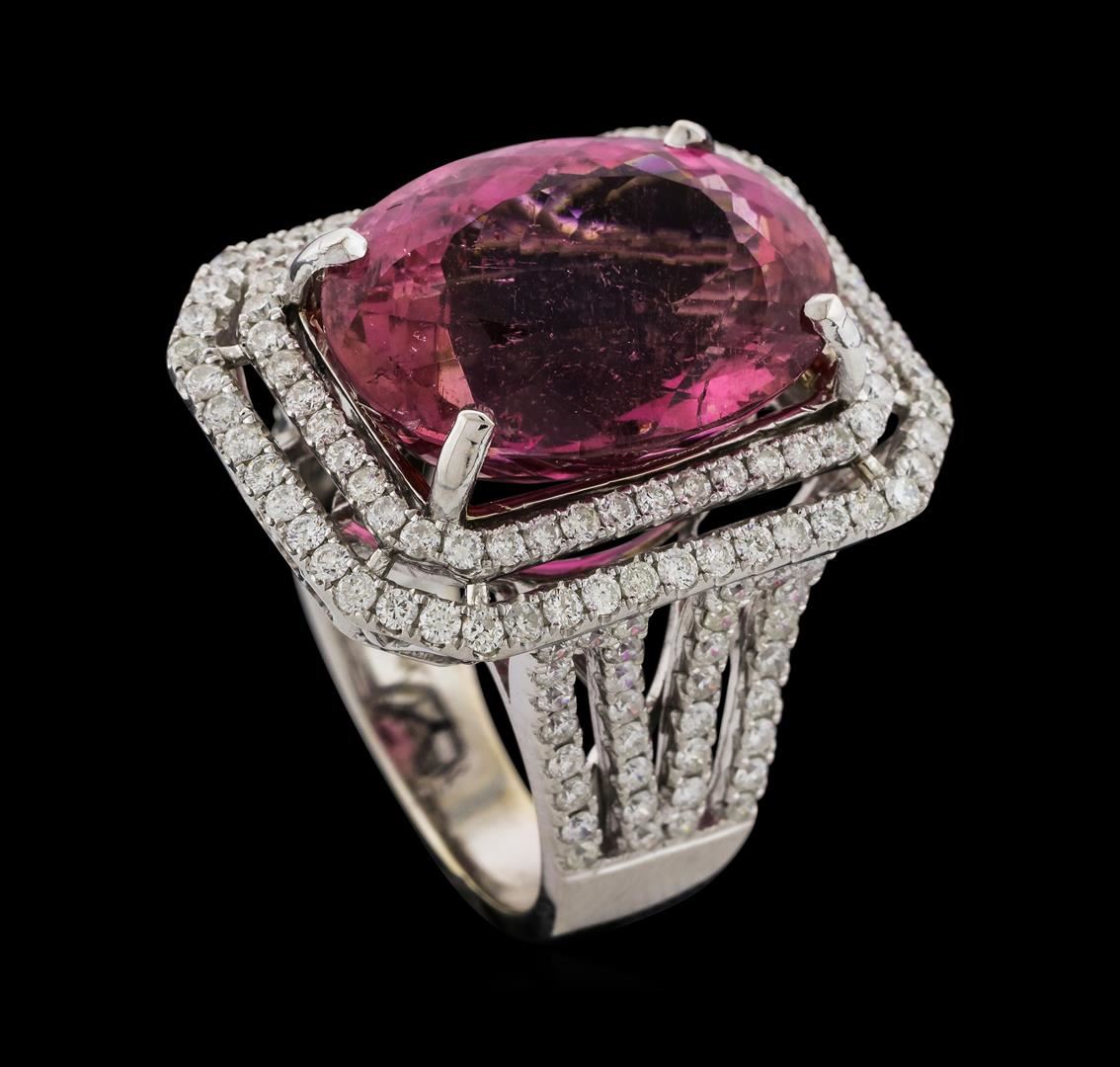 One 14KT White Gold Lady's Ring with a total weight of 13.30 grams. Containing: Main Gemstones: Identity: Natural Pink Tourmaline. Carat Weight: 16.15 cts tw. Shape & Measurement: Oval Cut. Quality: Fine Pink Color, Fine Cutting. Adjacent Gemstones: Identity: Natural Diamond. Shape: Round Cut. Carat Weight: 1.79 cts tw. Quality: SI Clarity, G-H Color. All Fine Cutting and proportions. Total Gemstones weight: 17.94 cts tw. RBGS Appraised at $12,000.00.