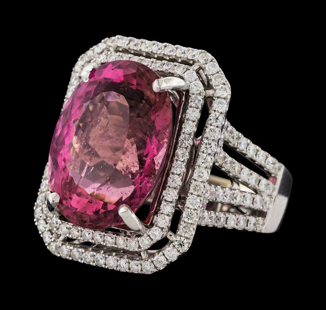 One 14KT White Gold Lady's Ring with a total weight of 13.30 grams. Containing: Main Gemstones: Identity: Natural Pink Tourmaline. Carat Weight: 16.15 cts tw. Shape & Measurement: Oval Cut. Quality: Fine Pink Color, Fine Cutting. Adjacent Gemstones: Identity: Natural Diamond. Shape: Round Cut. Carat Weight: 1.79 cts tw. Quality: SI Clarity, G-H Color. All Fine Cutting and proportions. Total Gemstones weight: 17.94 cts tw. RBGS Appraised at $12,000.00.