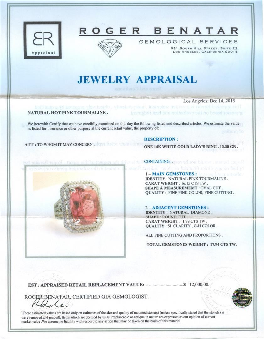 One 14KT White Gold Lady's Ring with a total weight of 13.30 grams. Containing: Main Gemstones: Identity: Natural Pink Tourmaline. Carat Weight: 16.15 cts tw. Shape & Measurement: Oval Cut. Quality: Fine Pink Color, Fine Cutting. Adjacent Gemstones: Identity: Natural Diamond. Shape: Round Cut. Carat Weight: 1.79 cts tw. Quality: SI Clarity, G-H Color. All Fine Cutting and proportions. Total Gemstones weight: 17.94 cts tw. RBGS Appraised.