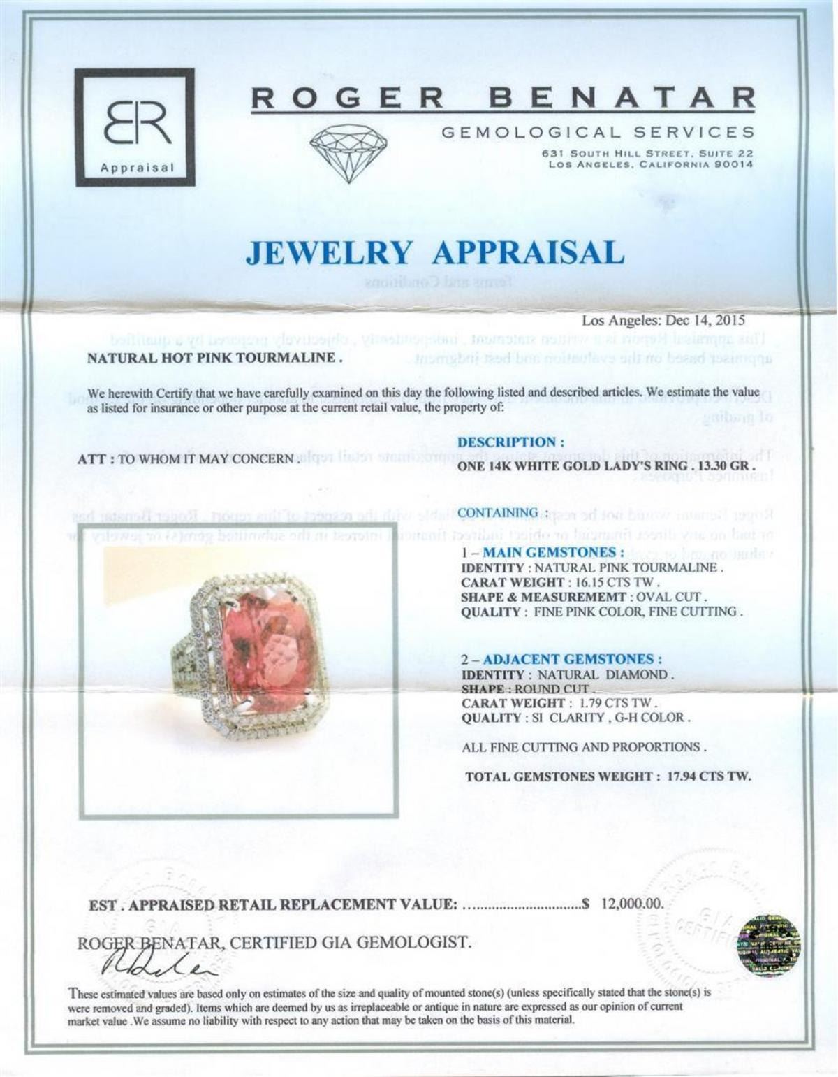 One 14KT White Gold Lady's Ring with a total weight of 13.30 grams. Containing: Main Gemstones: Identity: Natural Pink Tourmaline. Carat Weight: 16.15 cts tw. Shape & Measurement: Oval Cut. Quality: Fine Pink Color, Fine Cutting. Adjacent Gemstones: Identity: Natural Diamond. Shape: Round Cut. Carat Weight: 1.79 cts tw. Quality: SI Clarity, G-H Color. All Fine Cutting and proportions. Total Gemstones weight: 17.94 cts tw. RBGS Appraised.