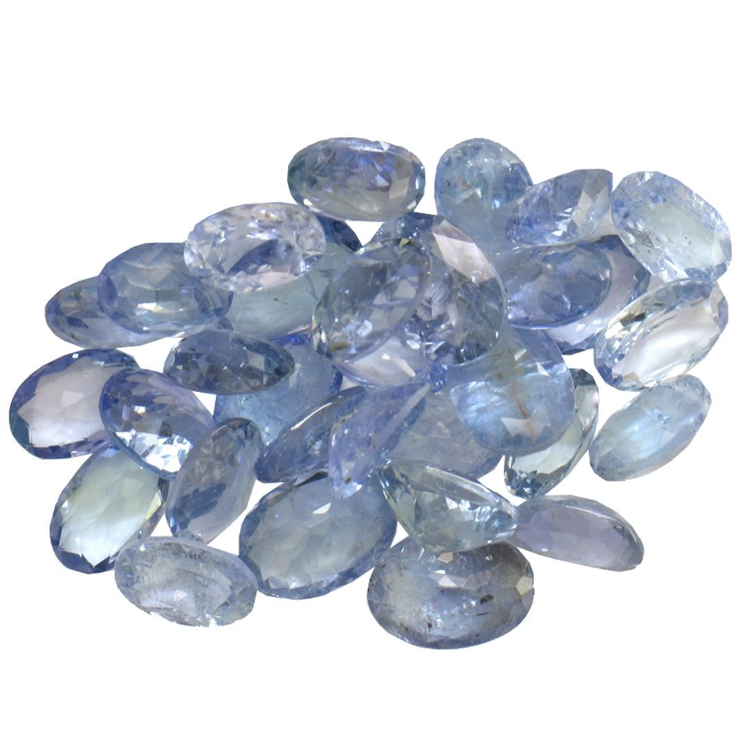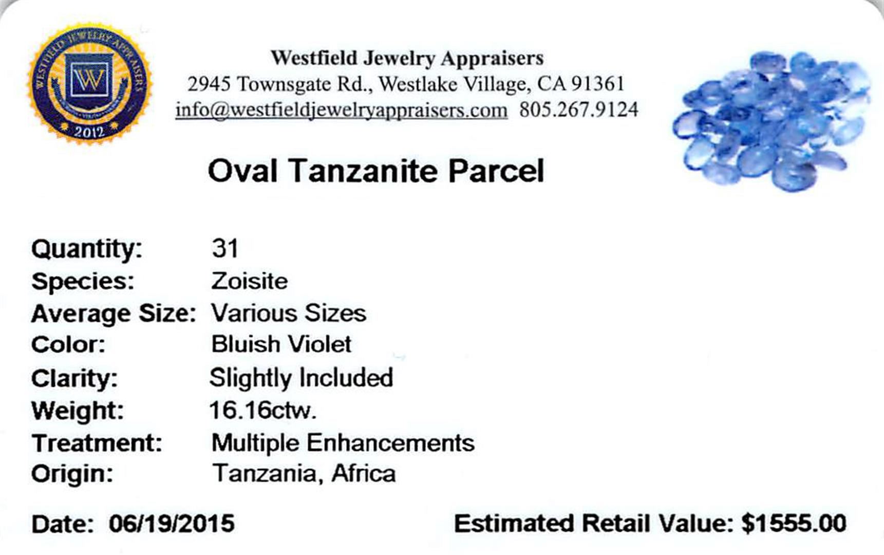 Thirty-one oval mixed cut natural tanzanites exact total weight 16.16ct., clarity is slightly included, type I, medium dark, very slightly grayish, bluish violet color, (GIA bV 6/3), cut is good. Transmitting light with a minimum of distortion, transparent. Naturally occurring internal & external characteristics are present. Color grade is an average for the group. Tanzanite is a very rare gemstone that is only found in the country of Tanzania. Originally discovered in 1967. Tiffany & Company, named the stone Tanzanite. It is found in the Usumburu Mountains that border the Umba Valley of northern Tanzania. Tanzanite occurs in gray, brown, violet, blue, reddish-purple, & green. The gem is interesting because of its exceptional pleochroism. Rotated in different directions a tanzanite will exhibit multiple changes of color. Tanzanite has a low tolerance to ultrasonic cleaning, and should not be cleaned using this method. Westfield Appraised at $1,555.00.