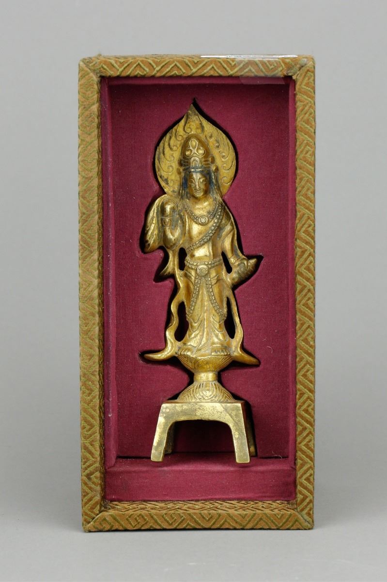Chinese gilt Buddha with stand; supported on four-legged stand; featuring standing Buddha wearing robe and cape; with glory behind his head; covered by gilt paint on whole body; Ming period 16th to 17th century; custom made box included; H: 18.5 cm, W: 6 cm, 216 grams