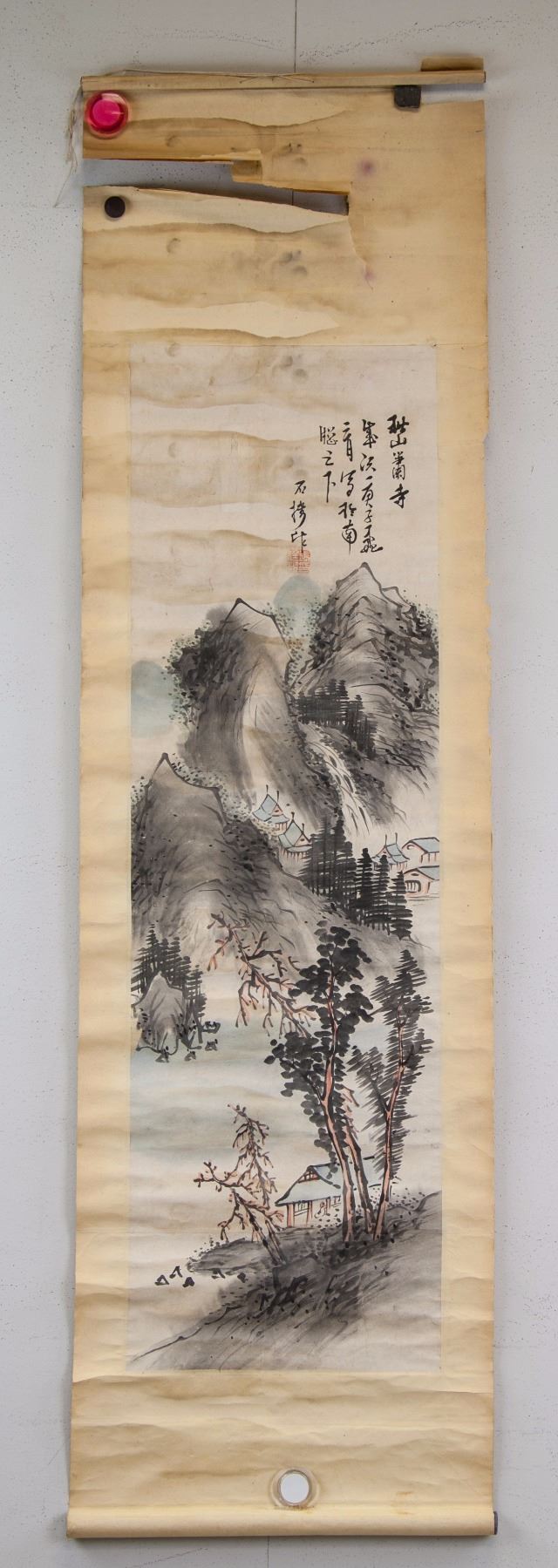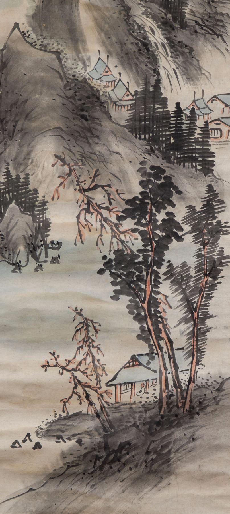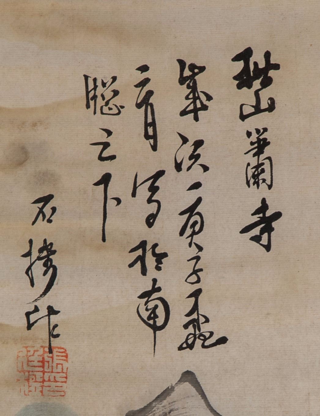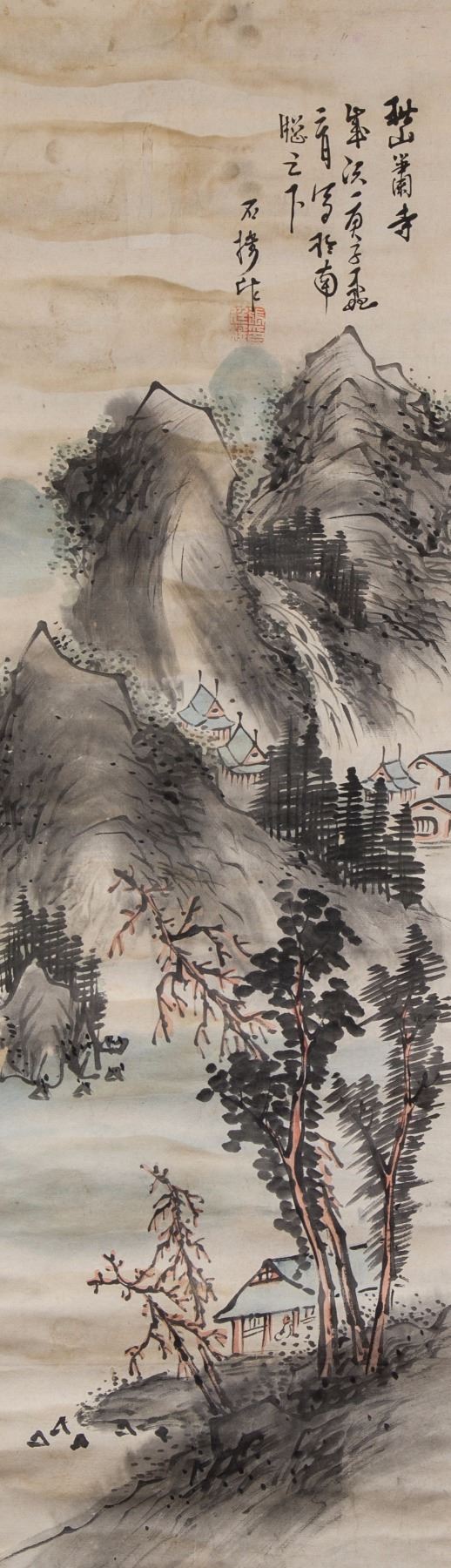 Mountainous landscape with temple; Chinese ink and watercolour on paper; hanging scroll; signed by artist; inscribed with 1 artist seals; 16th-18th century; 93 cm x 28 cm
