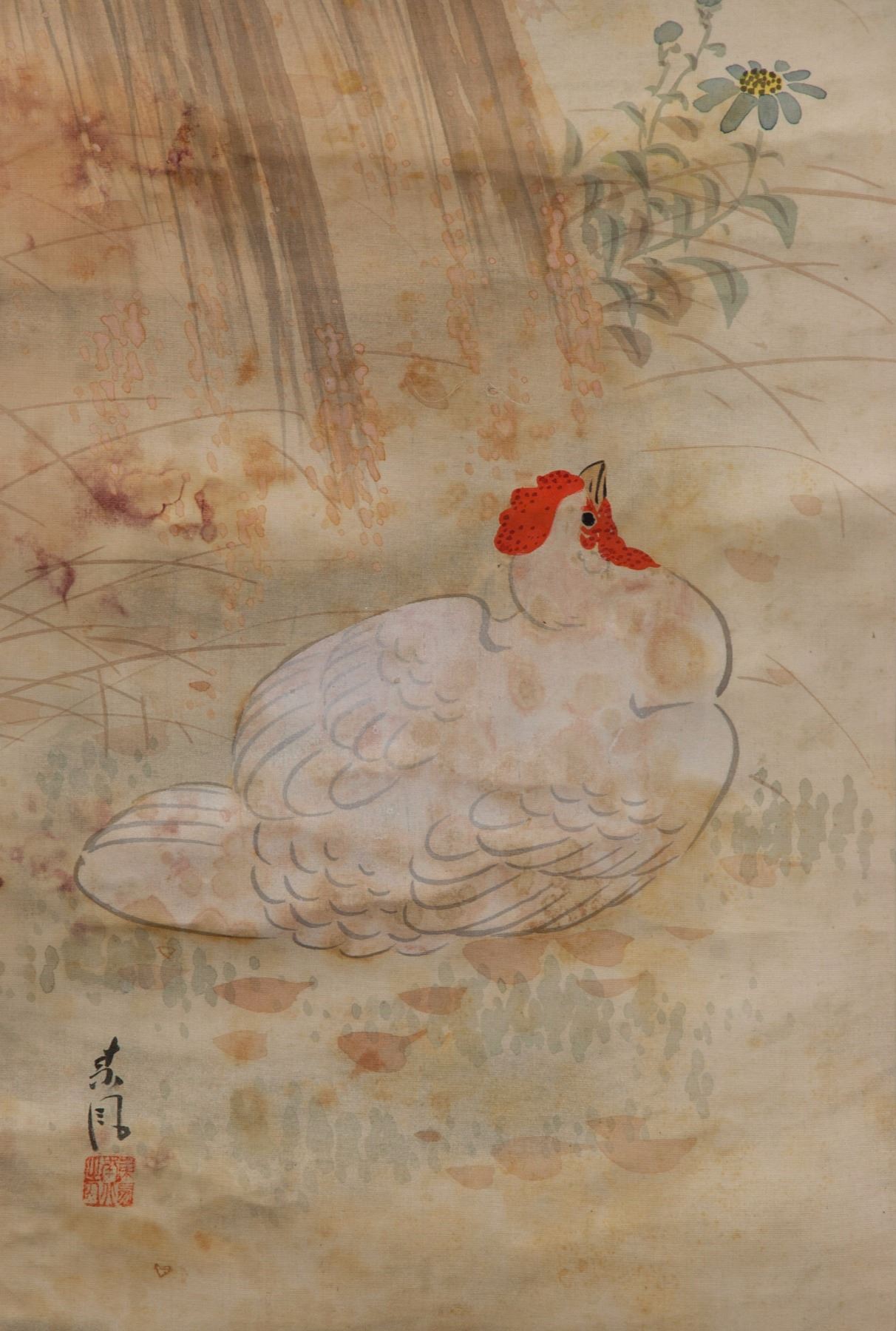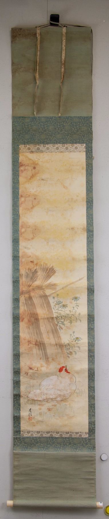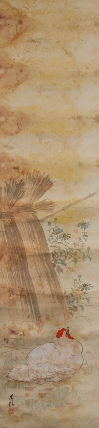Painting of hen; Chinese ink and watercolour on paper; hanging scroll; signed by artist; inscribed with 1 artist seal; 16th-18th century; 108 cm x 27 cm