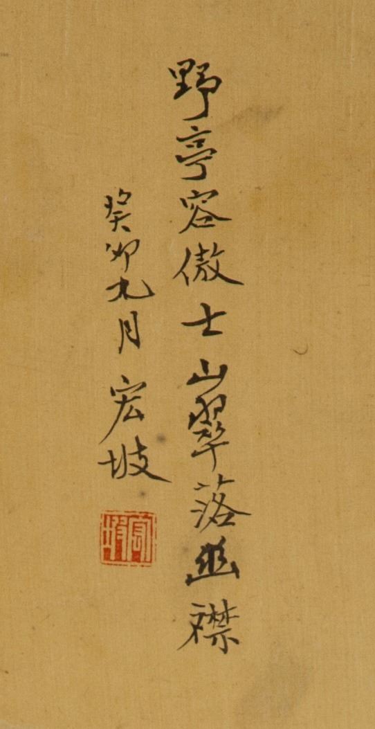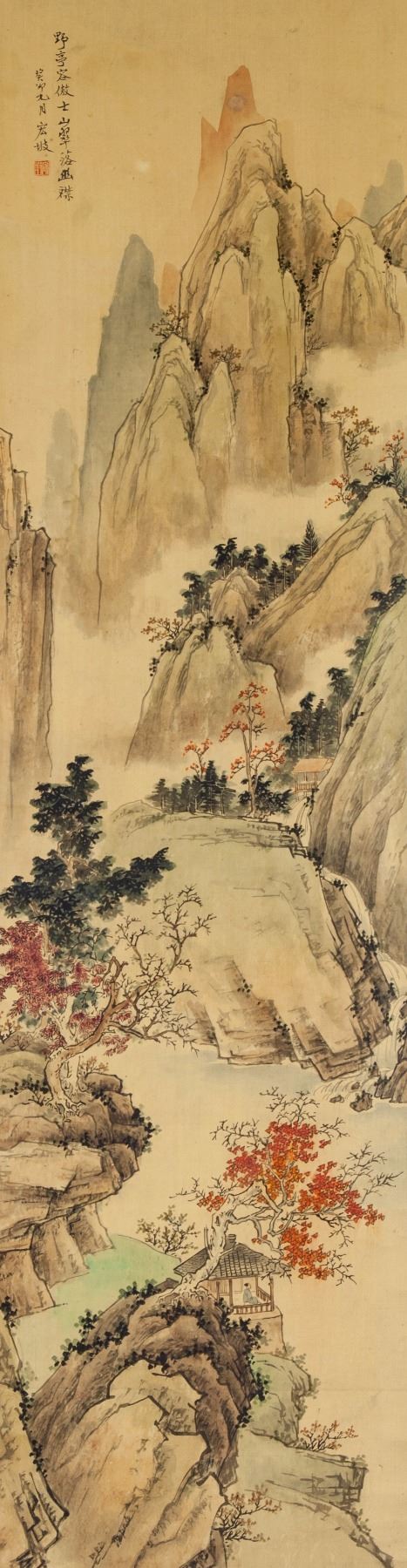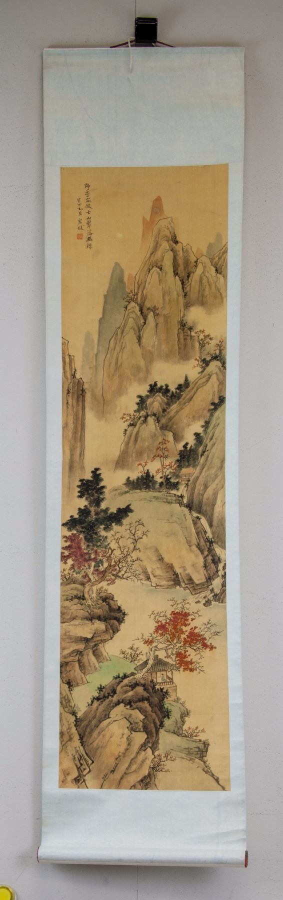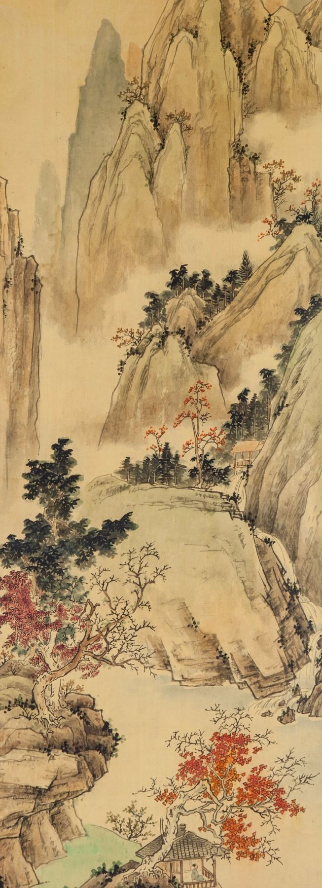 Mountainous landscape and pavilions; Chinese ink and watercolour on silk; hanging scroll; signed by artist; inscribed with 1 artist seal; 16th-18th century; 103 cm x 28 cm