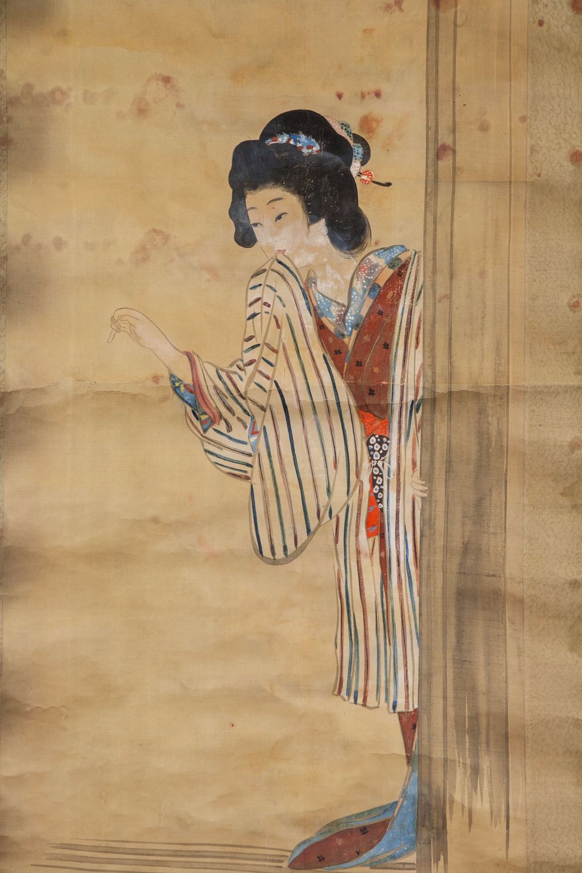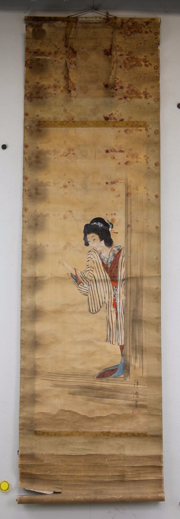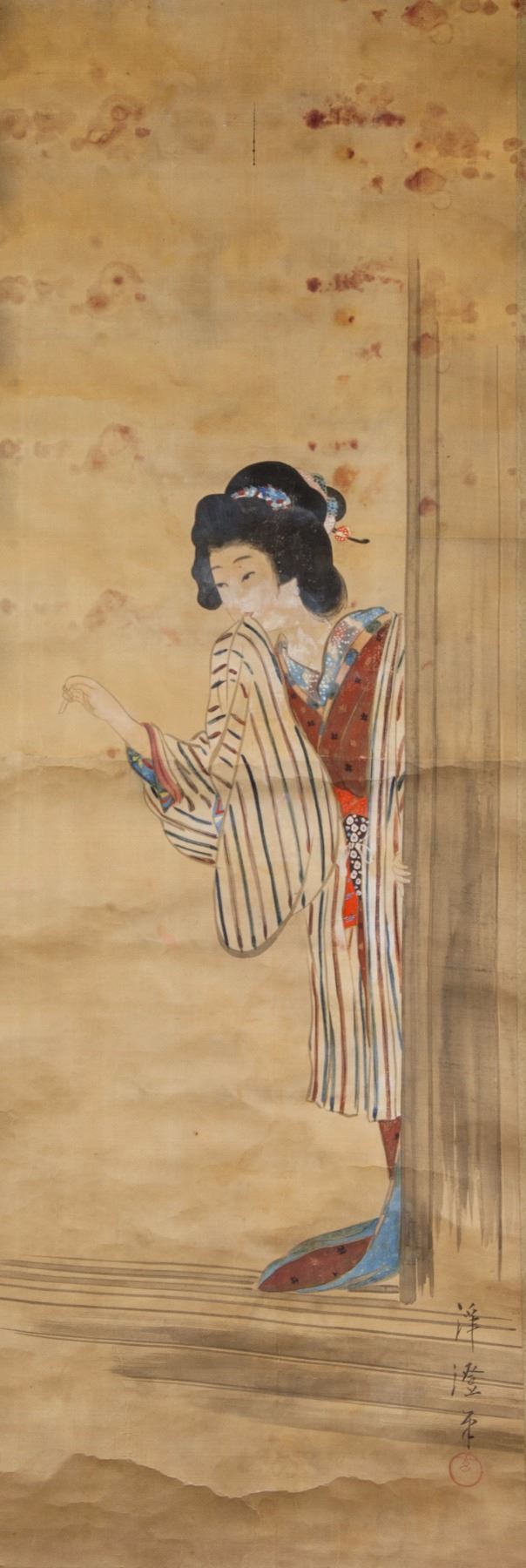 Painting of beauty in kimono; Japanese ink and watercolour on paper; hanging scroll; signed by artist; inscribed with 1 artist seal; 110 cm x 40 cm