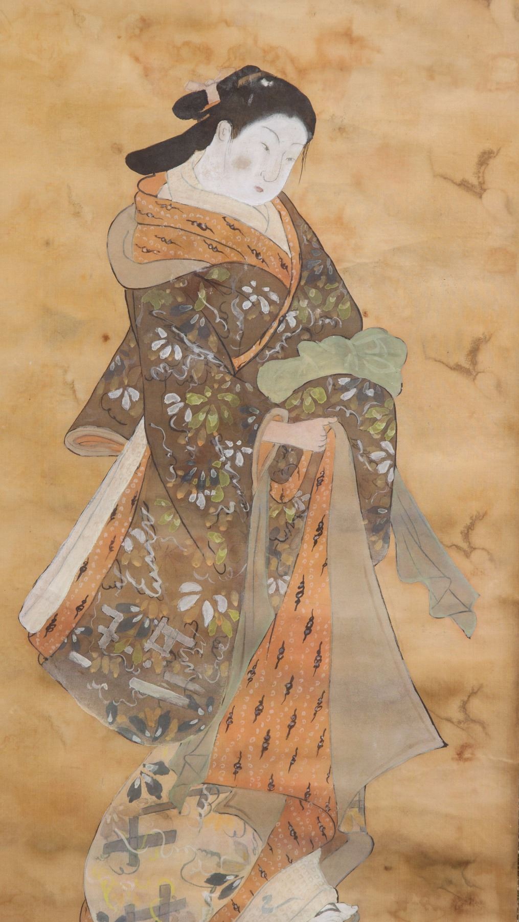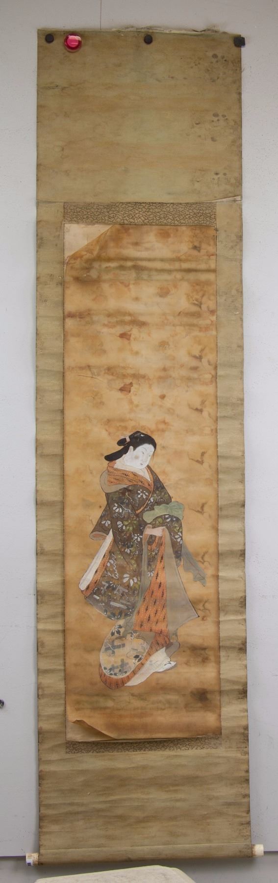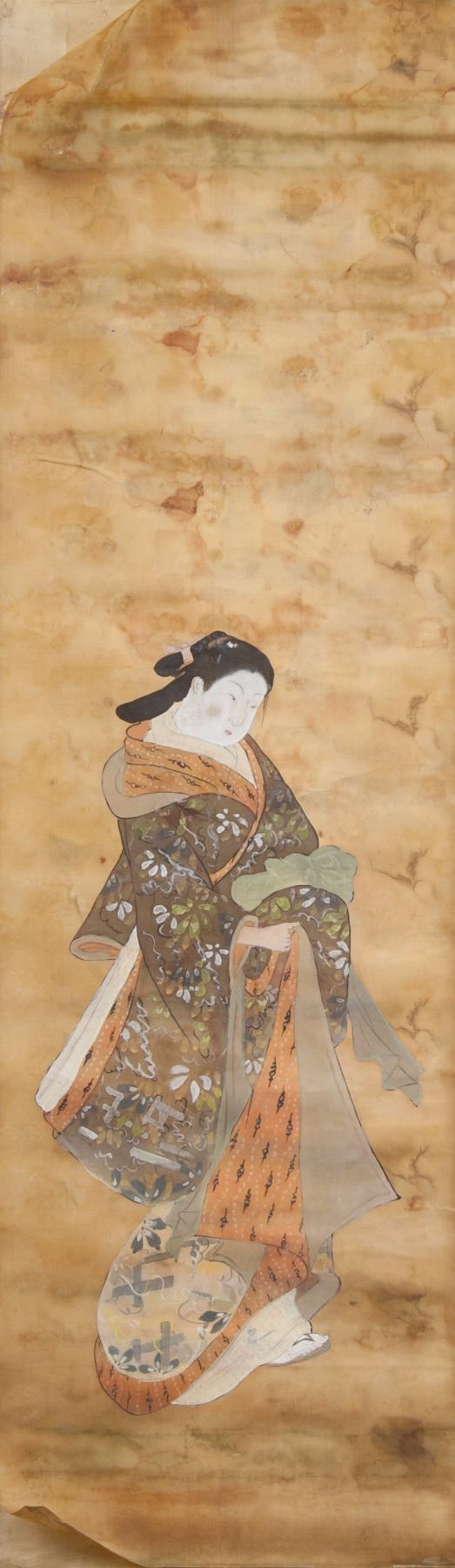 Painting a beauty in kimono; Japanese ink and watercolour on silk; hanging scroll; 16th-18th century; 112 cm x 35 cm