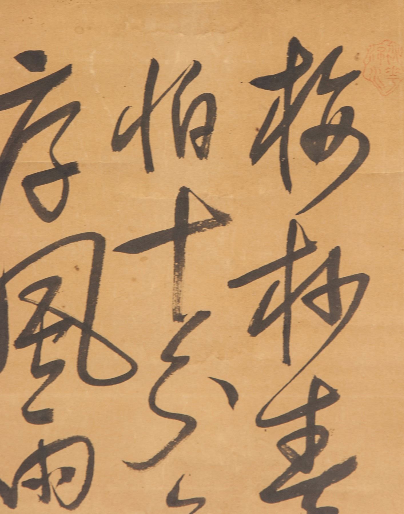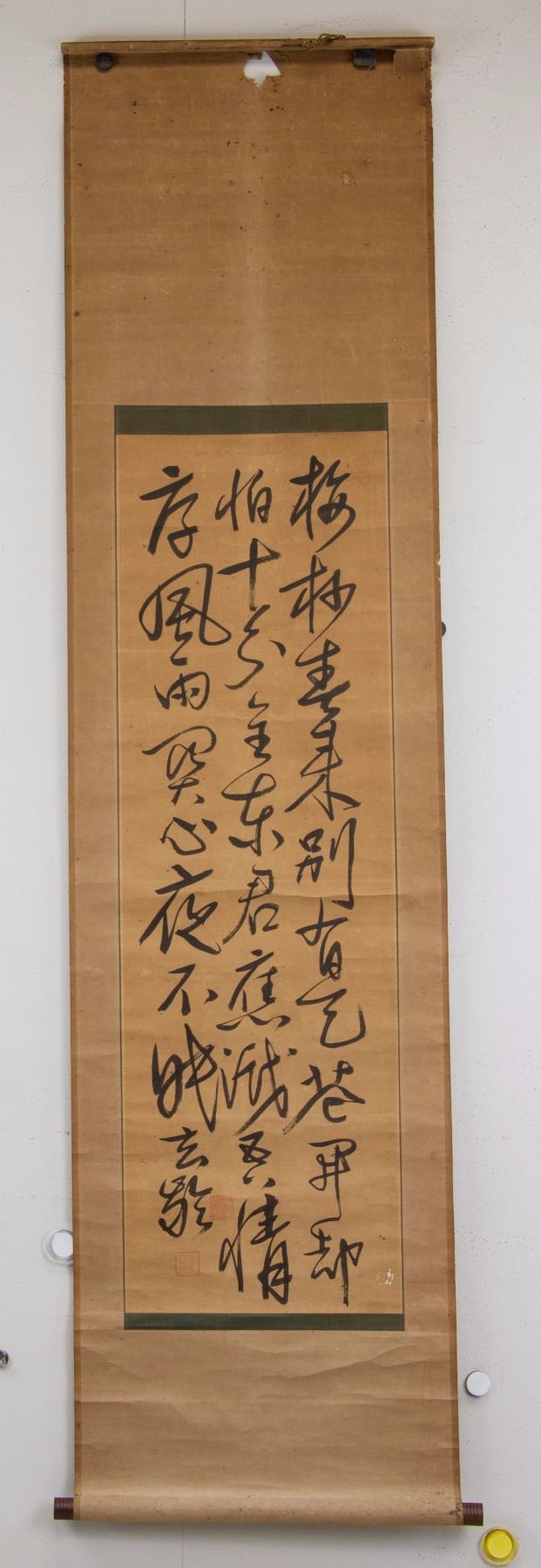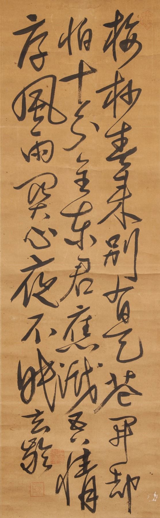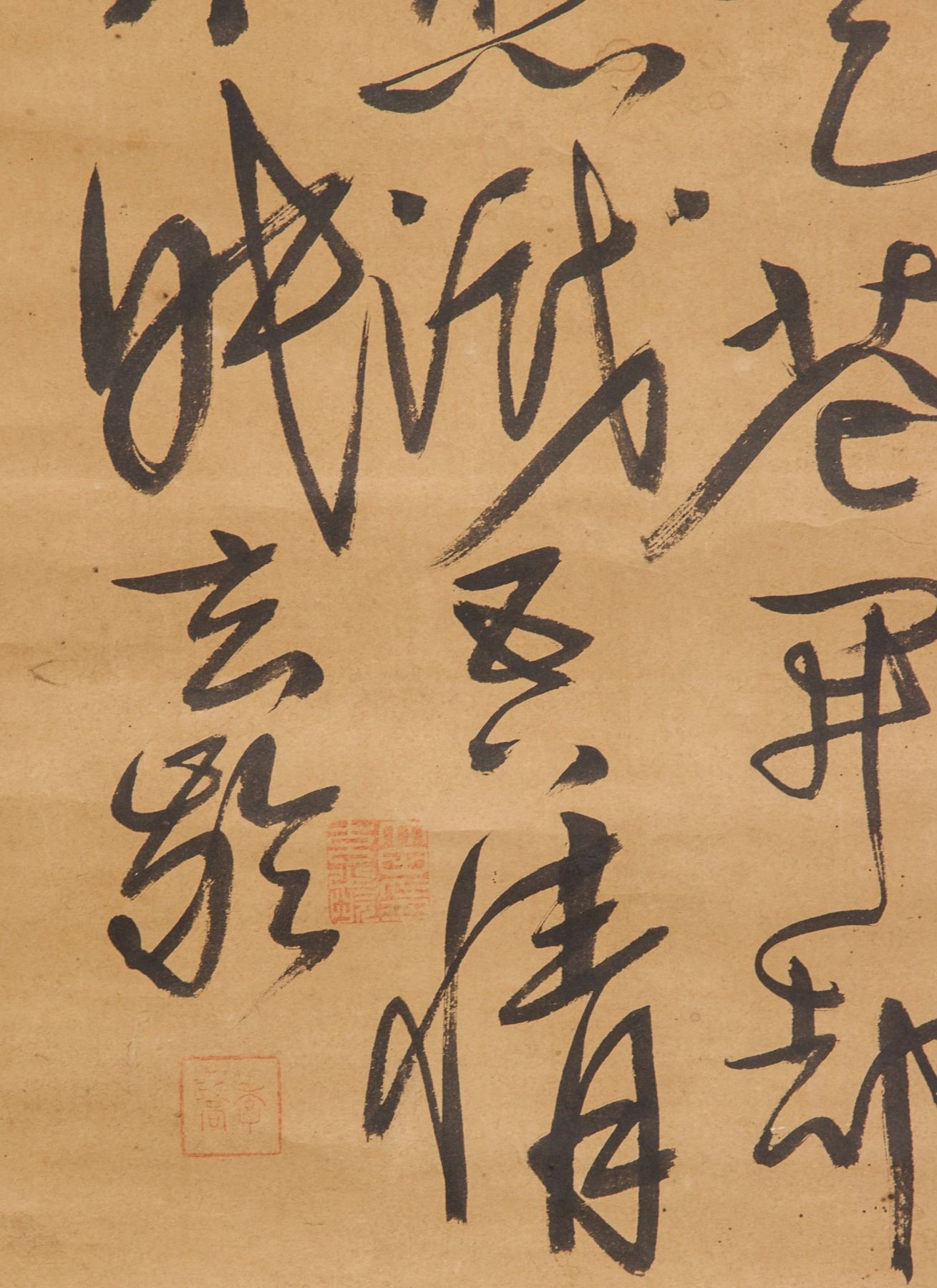 Chinese calligraphy in cursive script; Chinese ink on paper; hanging scroll; inscribed with 2 artist seals; 16th-18th century; 94 cm x 30 cm