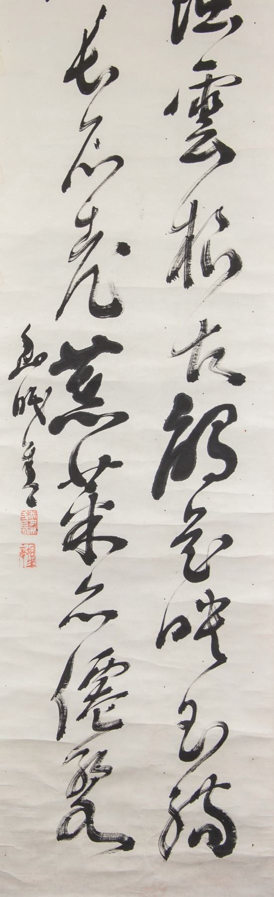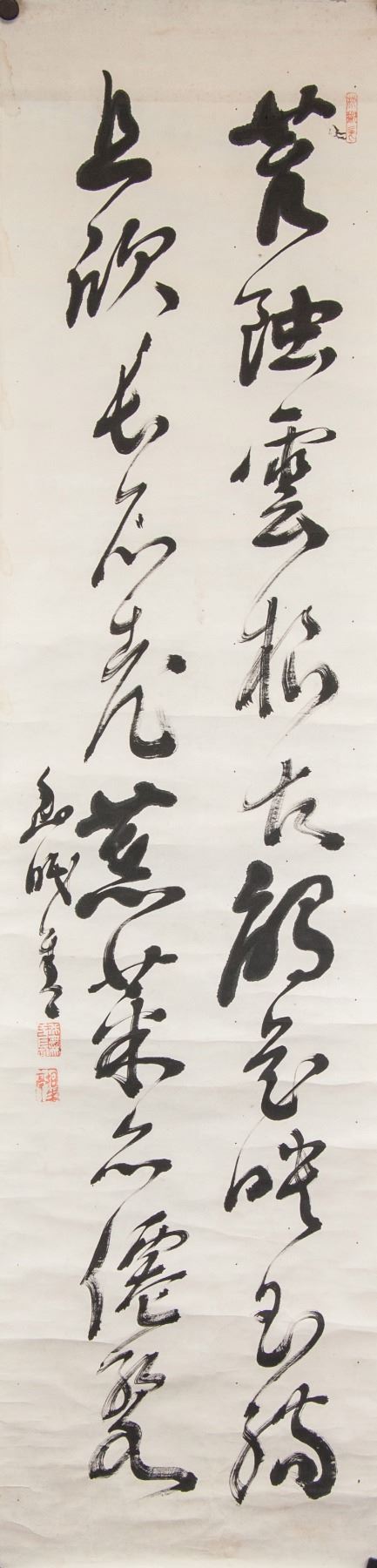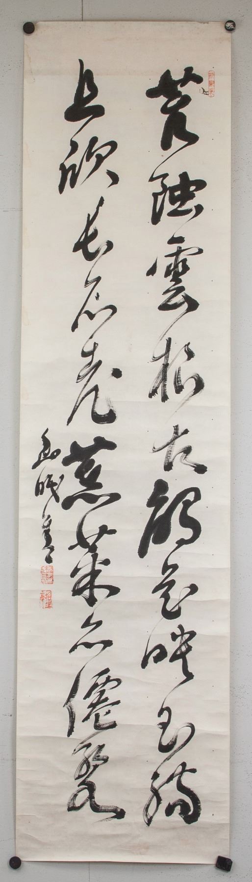 Chinese calligraphy in cursive script; Chinese ink on paper; signed by artist; inscribed with 3 artist seals; 16th-18th century; 137 cm x 34 cm