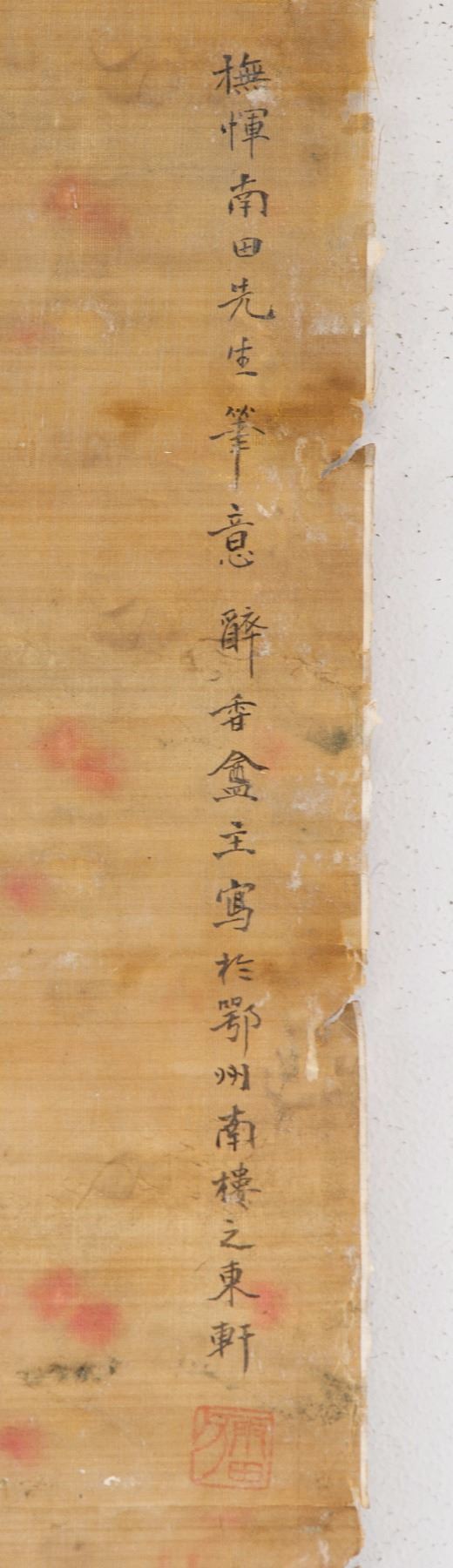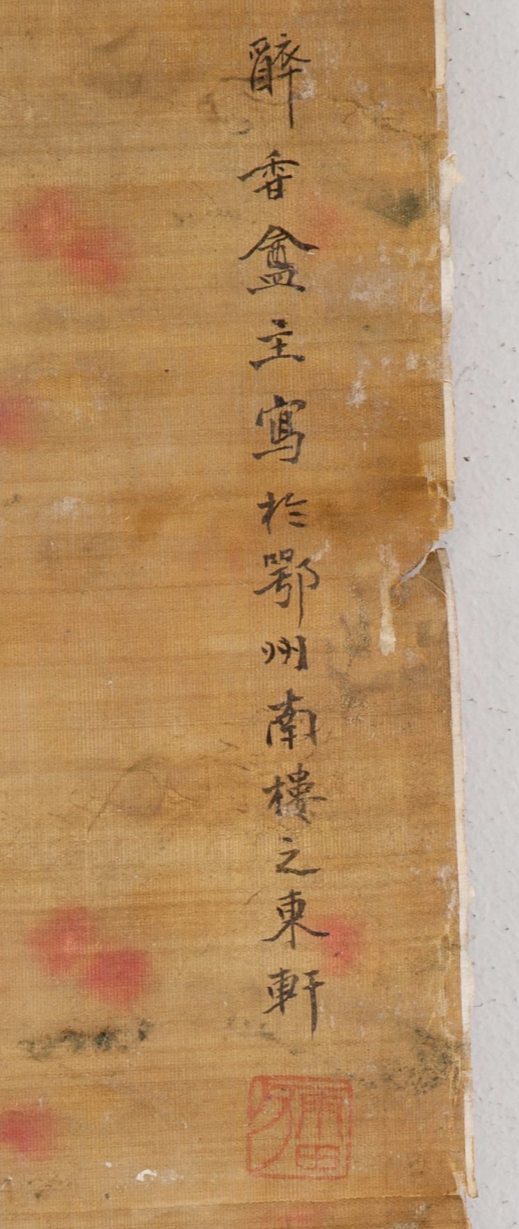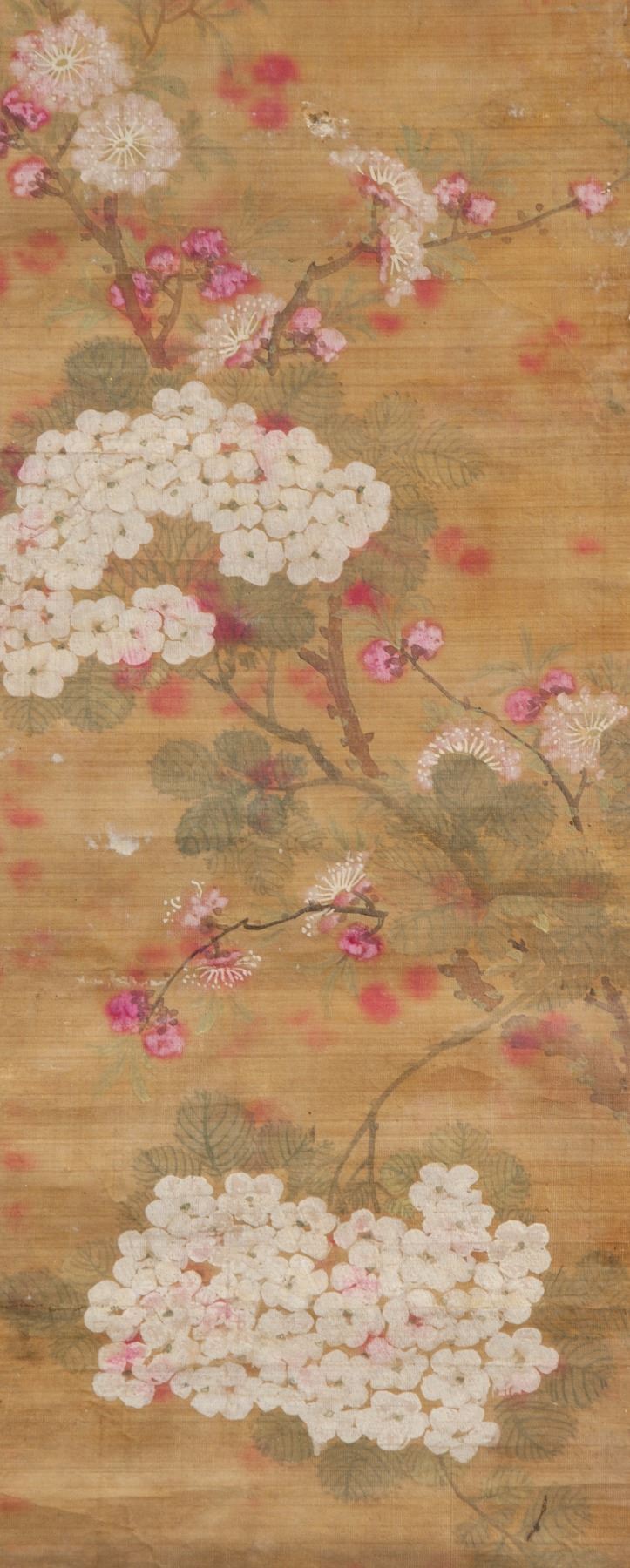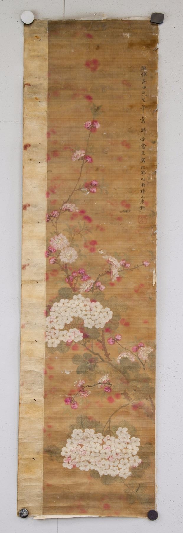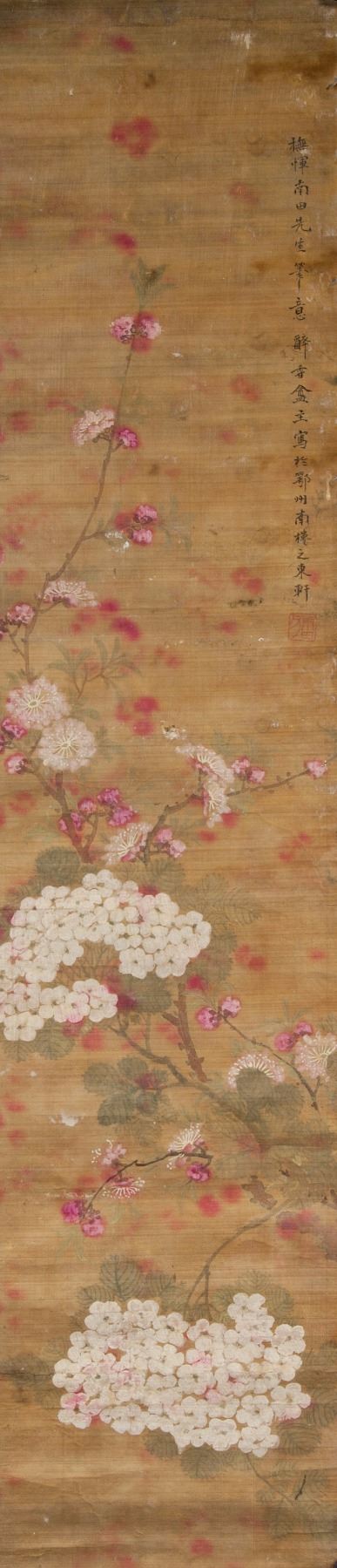 Painting of peach flower; Chinese ink and watercolour on silk roll; signed by artist; inscribed with 1 artist seal; 17th-18th century; 95 cm x 26 cm