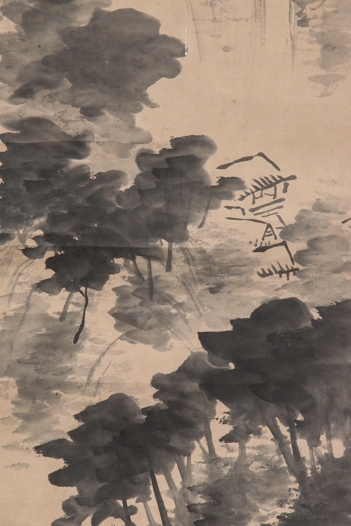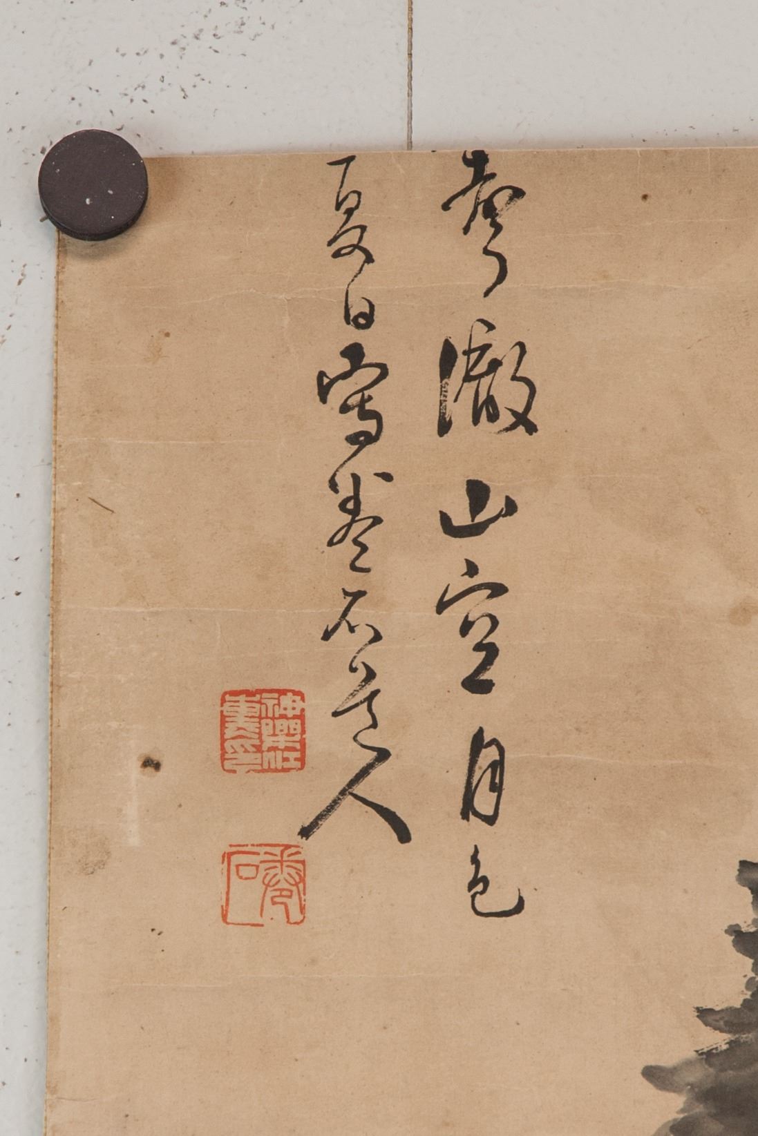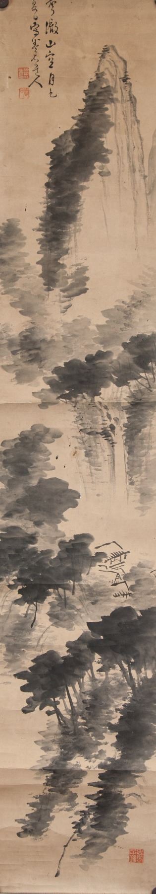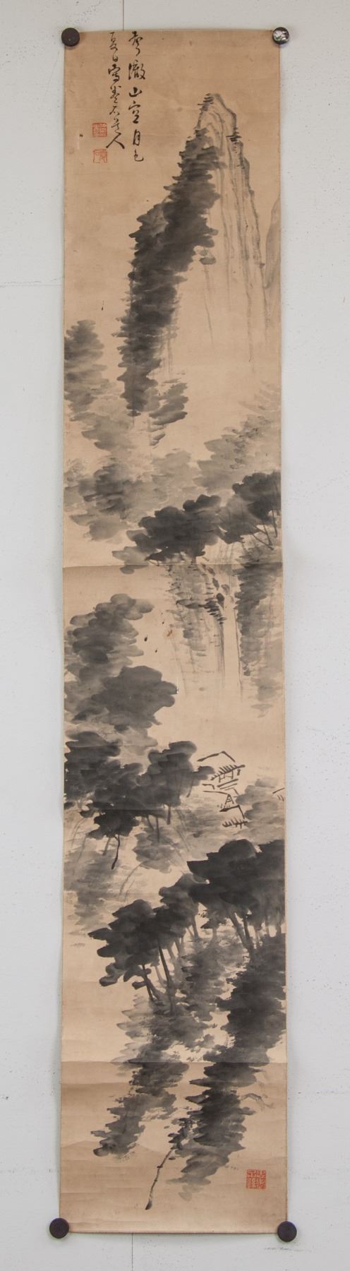 Painting of mountainous landscape; Chinese ink on paper; signed by artist; inscribed with 3 artist seals; 16th-18th century; 143 cm x 26 cm
