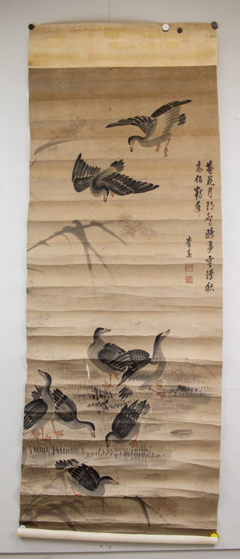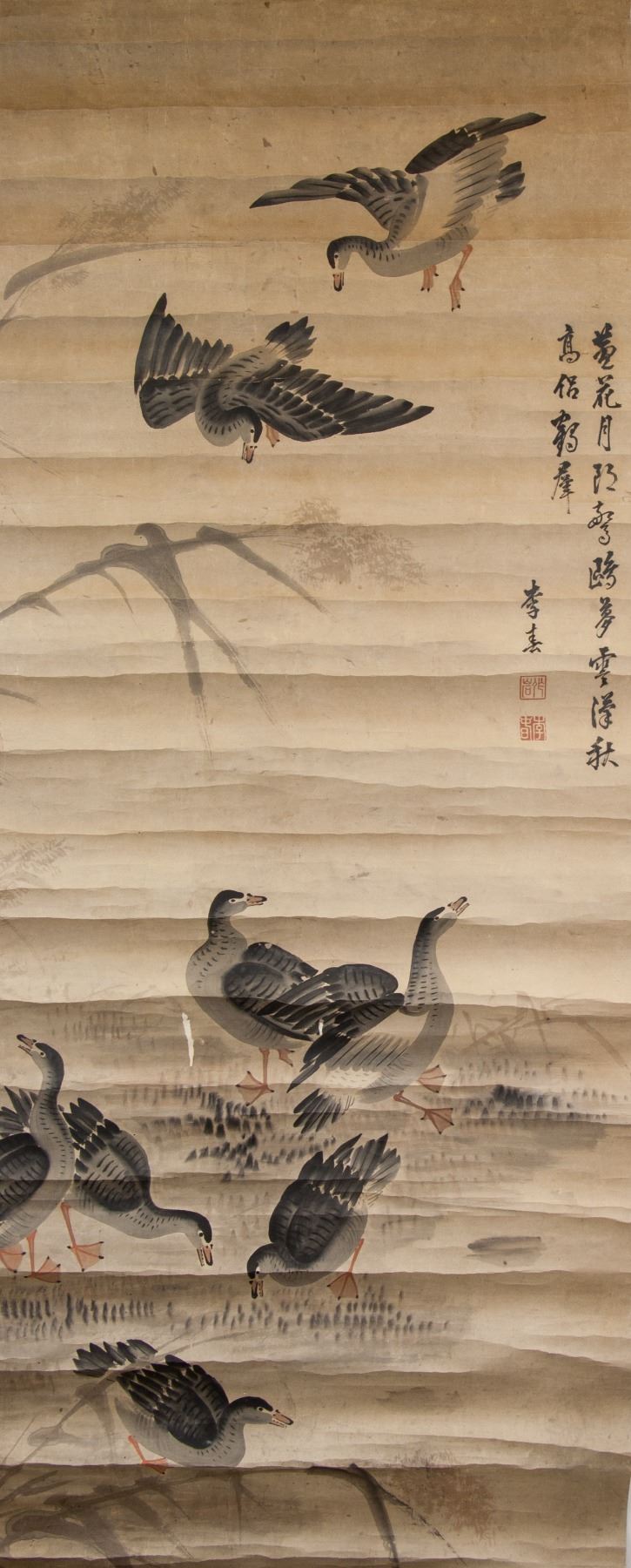 Painting of swan geese; Chinese ink and watercolour on paper roll; signed by artist; inscribed with 2 artist seals; 16th-18th century; 170 x 69 cm. PROVENANCE: Private American collection. Collection accumulated since 1945 in Japan and China; found in basement after his passing.