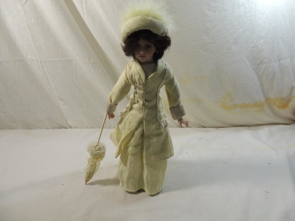 1900s-1910s FASHION BROWN HAIR GREEN EYES PORCELAIN DOLL, 16" TALL ON STAND BEAUTIFUL GOOD CONDITION COLLECTIBLE FROM PRIVATE DOLL COLLECTION. AS SHOWN SEE PHOTO FOR MORE DETAILS.