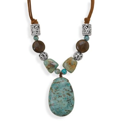 16" + 2" extension double strand brown cord necklace with pewter beads, 15mm faceted smoky quartz and Chinese Turquoise beads. The Chinese Turquoise drop is approximately 30mm x 44mm. This necklace has a lobster clasp closure. .925 Sterling Silver