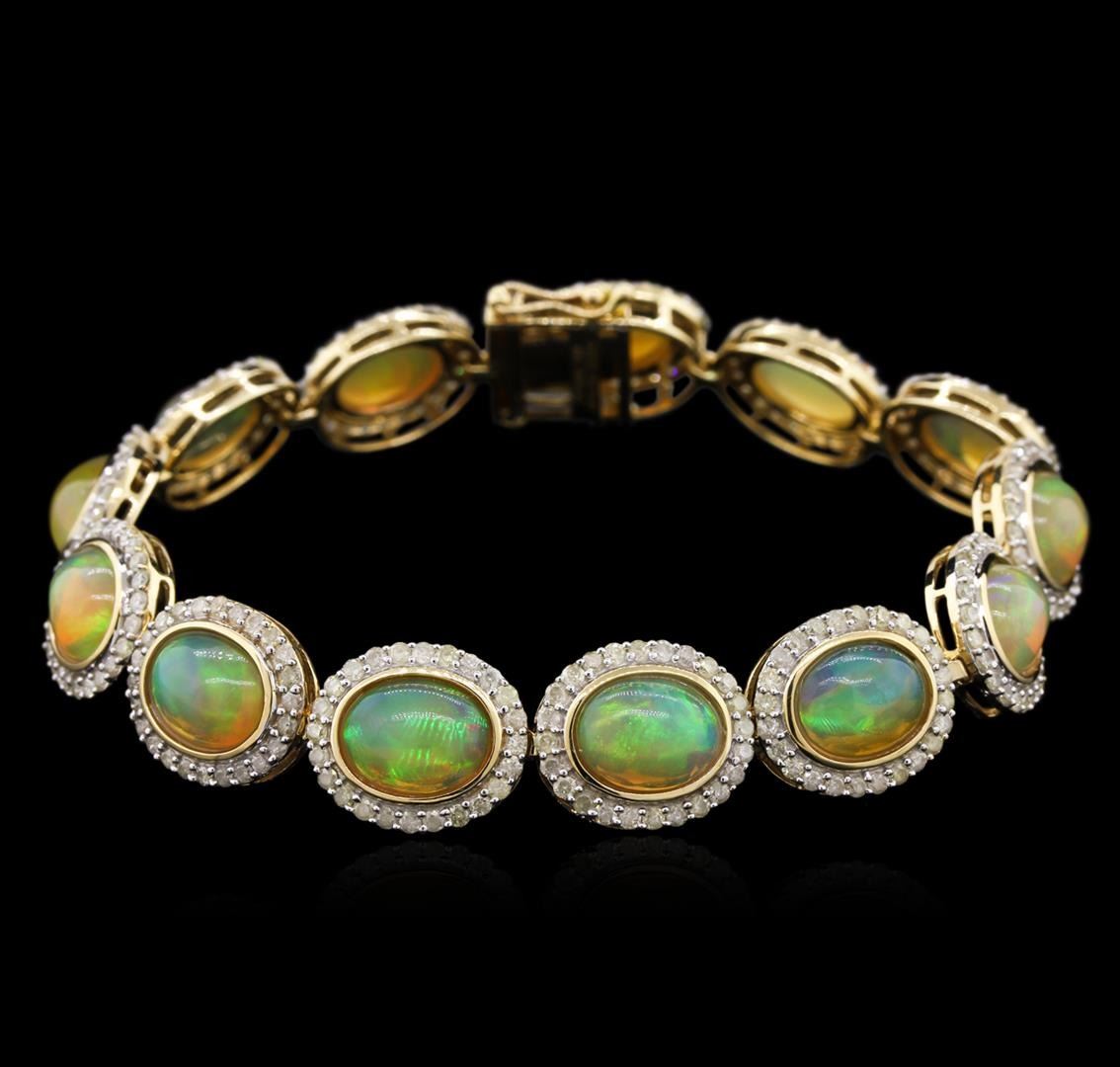 One electronically tested 14KT yellow gold ladies cast & assembled opal and diamond bracelet. Seven and one-quarter inch length bracelet features a flexible opal and diamond bezel ribbon, terminating in a concealed clasp with twin safeties. Bright polish finish with rhodium accents. Trademark is Orianne. Identified with markings of "14K". Condition is new, good workmanship. Containing: Thirteen jelly opals that are cut in a oval shaped cabochon and are bezel set, measuring 9.00 mm long x 7.00 mm wide, and 4.40 mm thick and the approximate weight is 16.20 carats. The opals have a somewhat bright, green only play of color (fire) in a flashfire pattern; a high dome; a good cut; slightly included; slight variation in base in their brightness and pattern; and are somewhat directional. Measurements are an average for the group. Graded in the setting. Three Hundred Twelve prong set round brilliant cut diamonds approximate total weight of 312 Stones = 3.67ct. Graded in the setting. Clarity: I-2 to I-3. Color: I - K. Total Weight of Diamonds 3.67ct. Total Weight of Opals 16.20ct. Total Weight of Bracelet 20.77gm. AIG Appraised at $13,800.00.