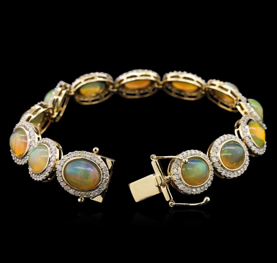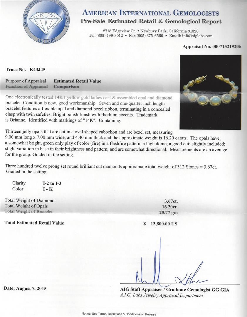 One electronically tested 14KT yellow gold ladies cast & assembled opal and diamond bracelet. Seven and one-quarter inch length bracelet features a flexible opal and diamond bezel ribbon, terminating in a concealed clasp with twin safeties. Bright polish finish with rhodium accents. Trademark is Orianne. Identified with markings of "14K". Condition is new, good workmanship. Containing: Thirteen jelly opals that are cut in a oval shaped cabochon and are bezel set, measuring 9.00 mm long x 7.00 mm wide, and 4.40 mm thick and the approximate weight is 16.20 carats. The opals have a somewhat bright, green only play of color (fire) in a flashfire pattern; a high dome; a good cut; slightly included; slight variation in base in their brightness and pattern; and are somewhat directional. Measurements are an average for the group. Graded in the setting. Three Hundred Twelve prong set round brilliant cut diamonds approximate total weight of 312 Stones = 3.67ct. Graded in the setting. Clarity: I-2 to I-3. Color: I - K. Total Weight of Diamonds 3.67ct. Total Weight of Opals 16.20ct. Total Weight of Bracelet 20.77gm. AIG Appraised at $13,800.00.