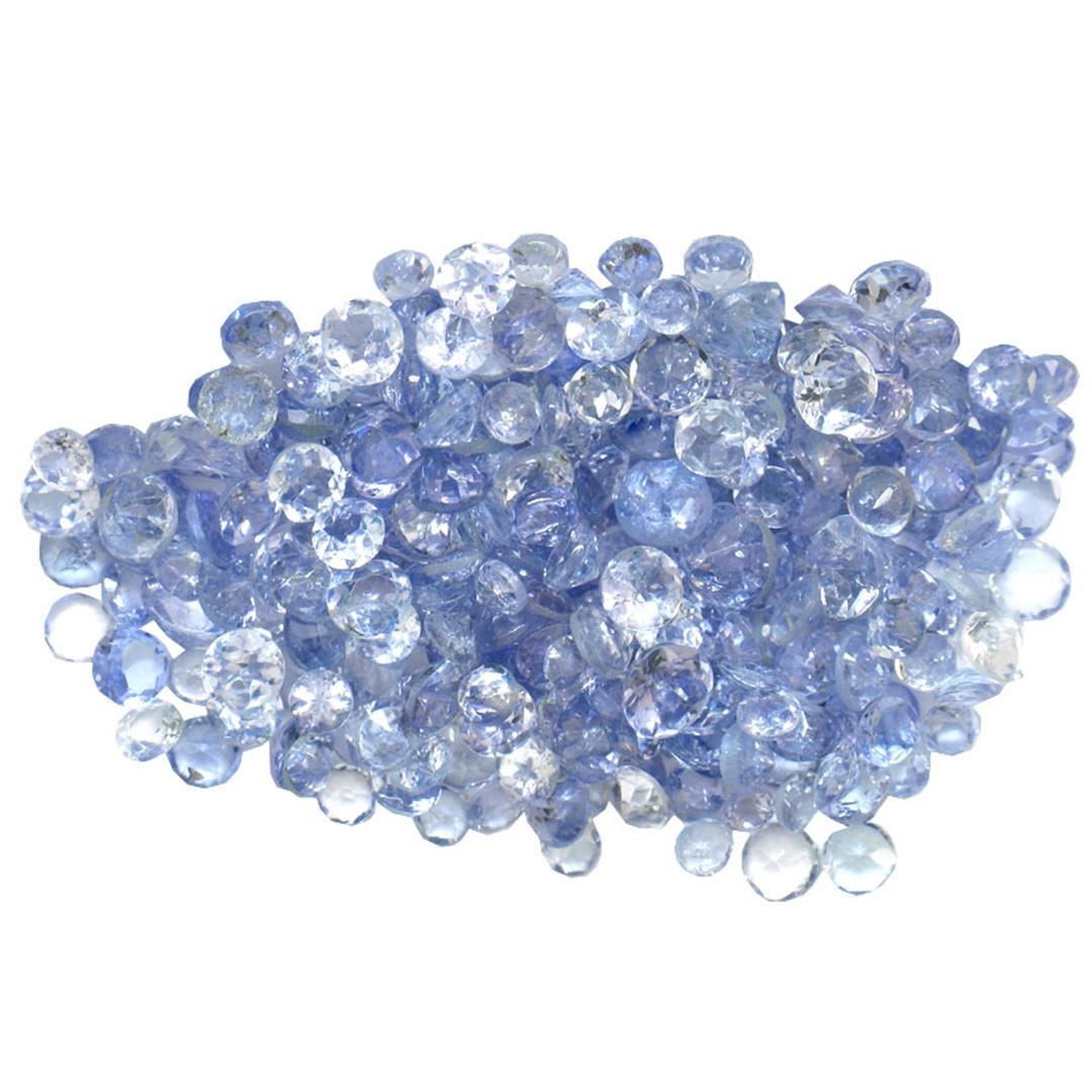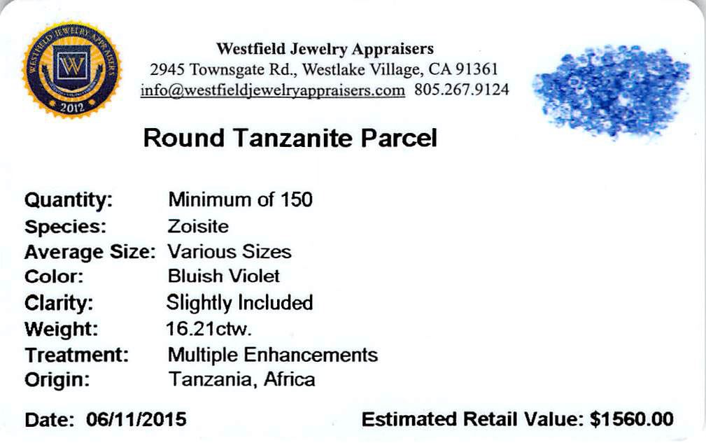 One hundred fifty round mixed cut natural tanzanites exact total weight 16.21ct., clarity is eye clean, type I, medium dark, very slightly grayish, bluish violet color, (GIA bV 6/3), cut is good. Transmitting light with no distortion, transparent. Color grade is an average for the group. Graded in the setting. Tanzanite is a very rare gemstone that is only found in the country of Tanzania. Originally discovered in 1967. Tiffany & Company, named the stone Tanzanite. It is found in the Usumburu Mountains that border the Umba Valley of northern Tanzania. Tanzanite occurs in gray, brown, violet, blue, reddish-purple, & green. The gem is interesting because of its exceptional pleochroism. Rotated in different directions a tanzanite will exhibit multiple changes of color. Tanzanite has a low tolerance to ultrasonic cleaning, and should not be cleaned using this method. Westfield Appraised at $1,560.00.