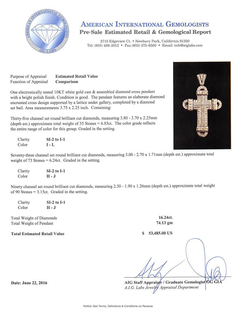 One electronically tested 10KT white gold cast & assembled diamond cross pendant with a bright polish finish. The pendant features an elaborate diamond encrusted cross design supported by a lattice under gallery, completed by a diamond set bail. Area measurements 3.75 x 2.25 inch. Condition is good. Containing: Thirty-Five channel set round brilliant cut diamonds, measuring 3.80 - 3.70 x 2.25mm (depth est.) approximate total weight of 35 Stones = 6.85ct. The color grade reflects the entire range of color for this group. Graded in the setting. Clarity: SI-2 to I-1 . Color: I - L Seventy-Three channel set round brilliant cut diamonds, measuring 3.00. - 2.70 x 1.71mm (depth est.) approximate total weight of 73 Stones = 6.24ct. Graded in the setting. Clarity: SI-2 to I-1 . Color: H - J Ninety channel set round brilliant cut diamonds, measuring 2.30 - 1.90 x 1.26mm (depth est.) approximate total weight of 90 Stones = 3.15ct. Graded in the setting. Clarity: SI-2 to I-1 . Color: H - J. Total Weight of Diamonds 16.24ct.. Total Weight of Pendant 74.13gm. AIG Appraised at $53,485.00.