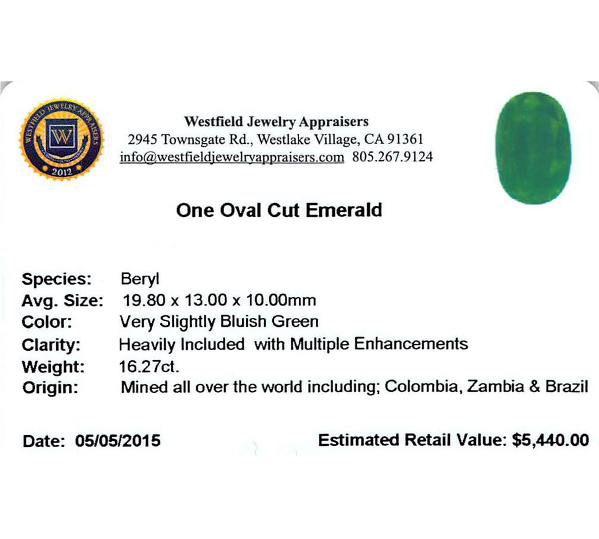 One oval cut natural emerald, measuring 19.80 x 13.00 x 10.00mm, exact weight 16.27ct., clarity is heavily included, type III, medium dark, very slightly grayish, very slightly bluish green color, (GIA vslbG 6/3), cut is good. Indications of multiple laboratory enhancements, including high temperature heat treatment. Westfield Appraised at $5,440.00.
