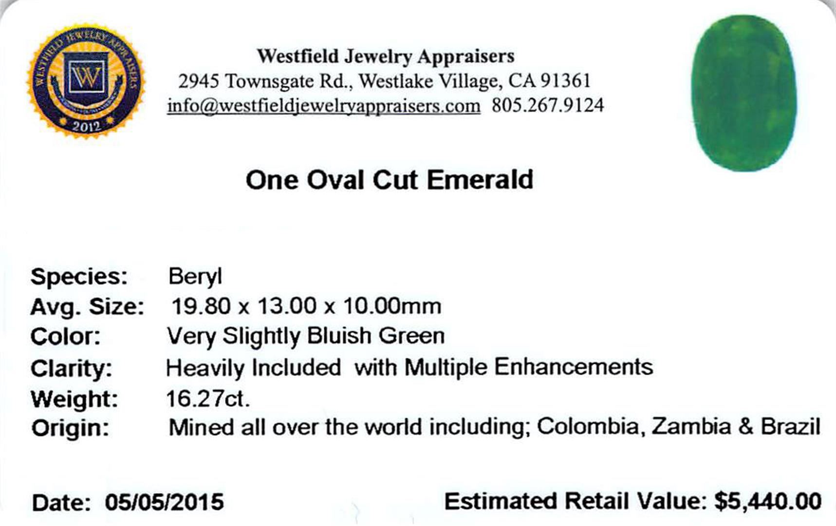 One oval cut natural emerald, measuring 19.80 x 13.00 x 10.00mm, exact weight 16.27ct., clarity is heavily included, type III, medium dark, very slightly grayish, very slightly bluish green color, (GIA vslbG 6/3), cut is good. Indications of multiple laboratory enhancements, including high temperature heat treatment. Westfield Appraised at $5,440.00.