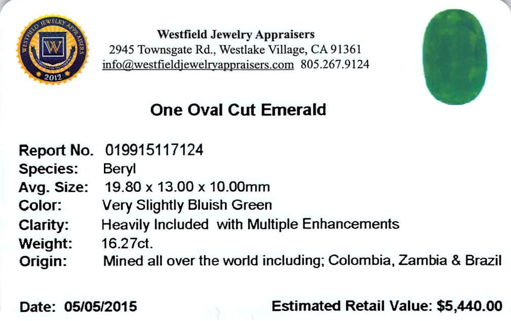 One oval cut natural emerald, measuring 19.80 x 13.00 x 10.00mm, exact weight 16.27ct., clarity is heavily included, type III, medium dark, very slightly grayish, very slightly bluish green color, (GIA vslbG 6/3), cut is good. Indications of multiple laboratory enhancements, including high temperature heat treatment. Westfield Appraised at $5,440.00.