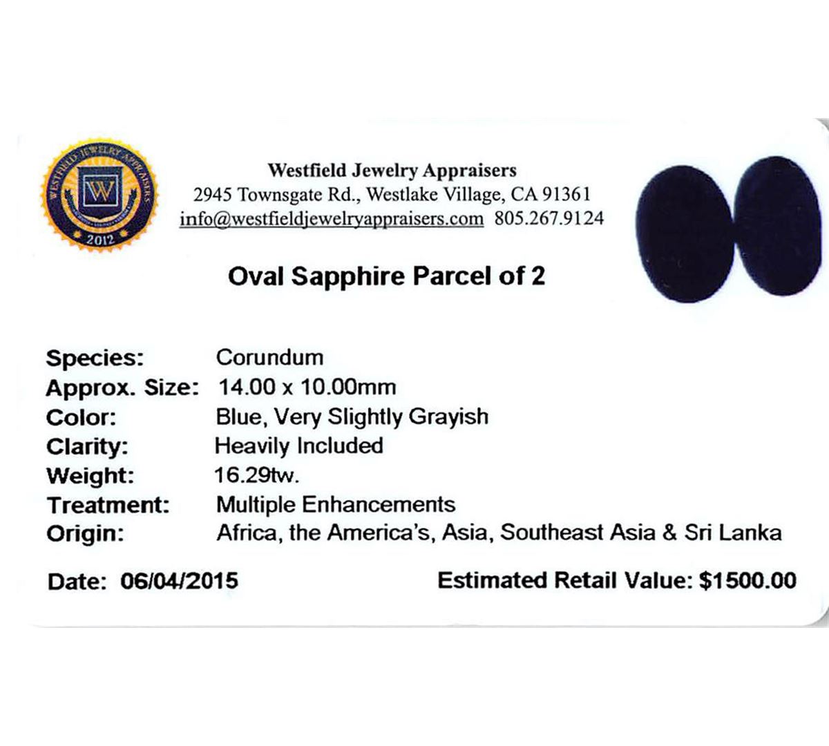 Two oval mixed cut natural blue sapphires, measuring 14.00 x 10.00 x 6.50mm, exact total weight 16.29ct., clarity is heavily included, type II, very dark, very slightly grayish, blue color, (GIA B 8/3), cut is good. Measurements are an average for the group. Transmitting light very diffusely, opaque, Naturally occurring internal & external characteristics are present, Indications of multiple laboratory enhancements, including high temperature heat treatment. Westfield Appraised at $1,500.00.