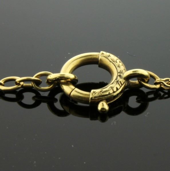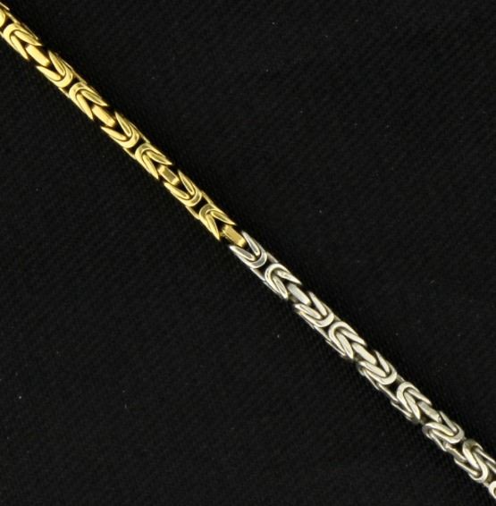 In 18K yellow & white gold, it is 1.35mm thick and has a large clasp. 7.2g