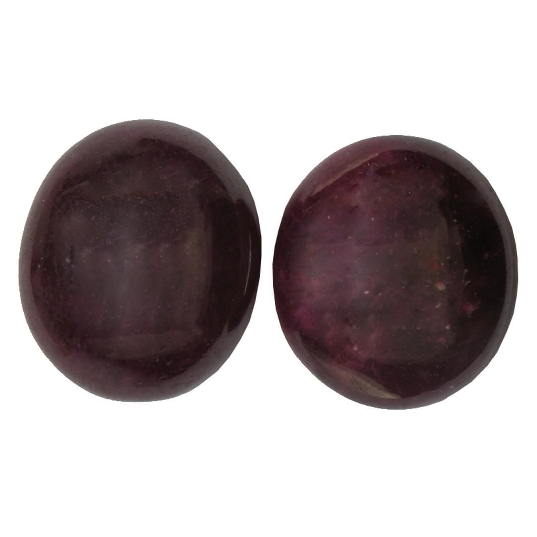 Two oval cabochon cut natural rubies, measuring 13.00 x 11.90 x 4.25mm, exact total weight 16.32ct., clarity is heavily included, type II, dark, very slightly brownish, slightly purplish red color, (GIA slpR 7/3), cut is good. Transmitting light diffusely, opaque. Naturally occurring internal & external characteristics are present. Indications of laboratory high temperature heat treatment, with glass & flux additives. Ruby has a low tolerance to rhodium plating, repolishing the surface, & ultrasonic cleaning._x000D_ Westfield Appraised at $1,630.00.