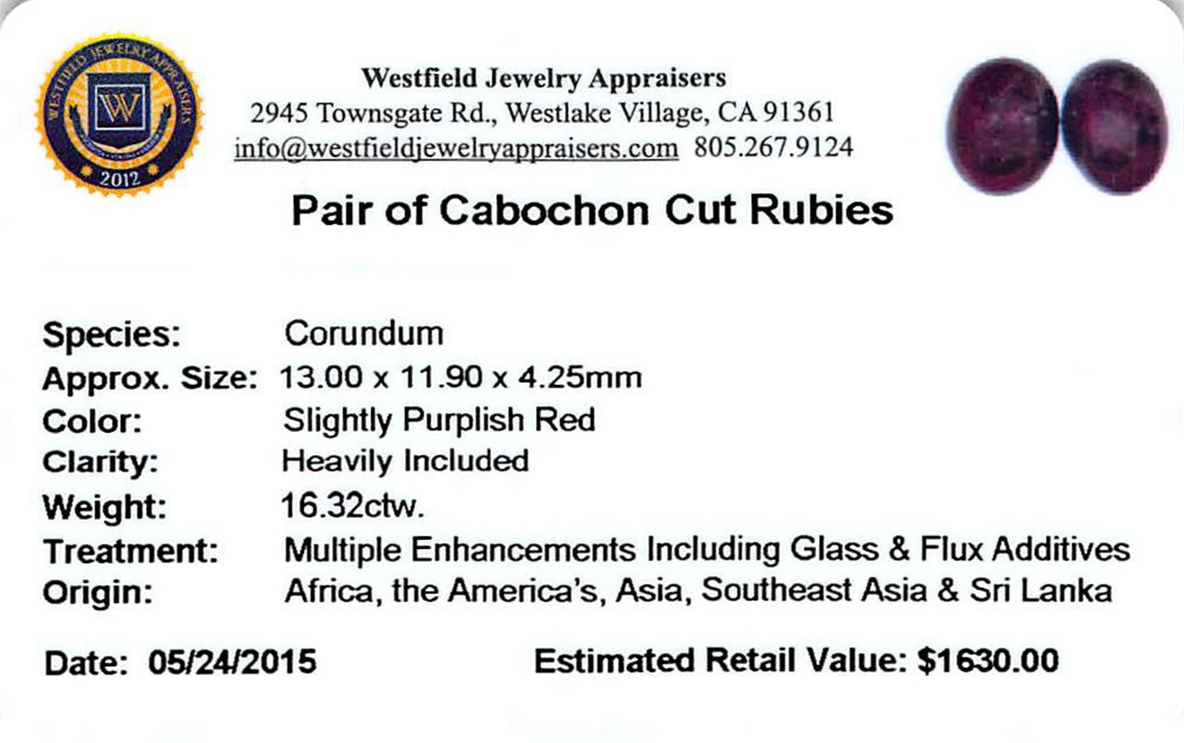 Two oval cabochon cut natural rubies, measuring 13.00 x 11.90 x 4.25mm, exact total weight 16.32ct., clarity is heavily included, type II, dark, very slightly brownish, slightly purplish red color, (GIA slpR 7/3), cut is good. Transmitting light diffusely, opaque. Naturally occurring internal & external characteristics are present. Indications of laboratory high temperature heat treatment, with glass & flux additives. Ruby has a low tolerance to rhodium plating, repolishing the surface, & ultrasonic cleaning._x000D_ Westfield Appraised.