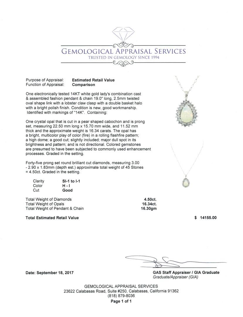 One electronically tested 14KT white gold lady's combination cast & assembled fashion pendant & chain 19.0' long, 2.5mm twisted oval shape link with a lobster claw clasp with a double basket halo with a bright polish finish. Identified with markings of '14K'. Condition is new, good workmanship. Containing: One crystal opal that is cut in a pear shaped cabochon and is prong set, measuring 22.50 mm long x 15.70 mm wide, and 11.52 mm thick and the approximate weight is 16.34 carats. The opal has a bright, multicolor play of color (fire) in a rolling flashfire pattern; a high dome; a good cut; slightly included; major dull spot in its brightness and pattern; and is not directional. Colored gemstones are presumed to have been subjected to commonly used enhancement processes. Graded in the setting. Forty-Five prong set round brilliant cut diamonds, measuring 3.00 - 2.90 x 1.83mm (depth est.) approximate total weight of 45 Stones = 4.50 ct. Graded in the setting. Color H - I Clarity SI-1 to I-1 Cut Good. Total Weight of Diamonds 4.50 ct.. Total Weight of Opals 16.34ct.. Total Weight of Pendant & Chain 16.30gm GAS Appraised at $14155.00. GAS Appraised.