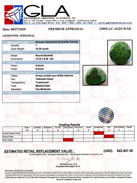 In the event that an item is listed as having an "Appraisal Estimate", this represents WAR's in-house estimate of what the item would appraise for at Gem Labs of America (GLA), Beverly Hills, CA. Actual appraisal of the item at GLA is the responsibility of the Bidder, however WAR may assist, at its discretion, in related logistics. WAR does provide the following guaranty (the "WAR 5% Loose Gem Guaranty") relative to Appraisal Estimate values of LOOSE GEMS: In the event that the GLA appraised value is not such an amount that the Bidder's winning bid is five percent (5%) or less of the GLA appraised value, then WAR, in it's discretion, will either refund such amount of the Bidder's winning bid and related charges so that the winning bid equals five percent (5%) of the GLA appraised value, or, instead issue a full refund on the item and reimburse the Bidder for the GLA appraisal fees. The Bidder may also opt to retain the item, in which case the WAR 5% Gem Guaranty shall not apply relative to the particular item.