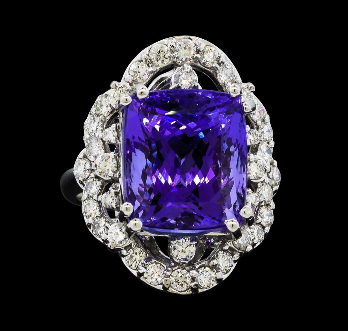 One electronically tested 14KT white gold lady's cast fashion ring with a scalloped basket halo with a bright polish finish. The featured lady's ring has a shank measuring 3.26 millimeters wide. Identified with markings of 'K14'. Condition is new, good workmanship. Containing: One prong set rectangular cushion modified brilliant cut natural tanzanite, measuring 13.57 x 11.80 x 11.25mm, (depth est.) 15%. bulge factor, approximate weight of 16.38ct., clarity is eye clean, medium dark, strong, bluish violet color, (GIA bV 6/5), cut is very good. Transmitting light with no distortion, transparent. Colored gemstones are presumed to have been subjected to commonly used enhancement processes. Graded in the setting. Ten prong set round brilliant cut diamonds, measuring 2.25 - 2.15 x 1.34mm (depth est.) approximate total weight of 10 Stones = 0.40ct. Graded in the setting. Clarity SI-1 to SI-2. Color: H - I Cut Good Twenty-Two prong set round brilliant cut diamonds, measuring 2.10 - 2.00 x 1.27mm (depth est.) approximate total weight of 22 Stones = 0.72ct. Graded in the setting. Clarity VS-2 to SI-2. Color: H - I Cut Good Four prong set round brilliant cut diamonds, measuring 1.50 - 1.45 x 0.92mm (depth est.) approximate total weight of 4 Stones = 0.05ct. Graded in the setting. Clarity SI-1 to SI-2. Color: H - I Cut Good. Total Weight of Colored Stones 16.38ct.. Total Weight of Diamonds 1.17ct.. Total Weight of Ring 11.70gm. GAS Appraised at $24,620.00.