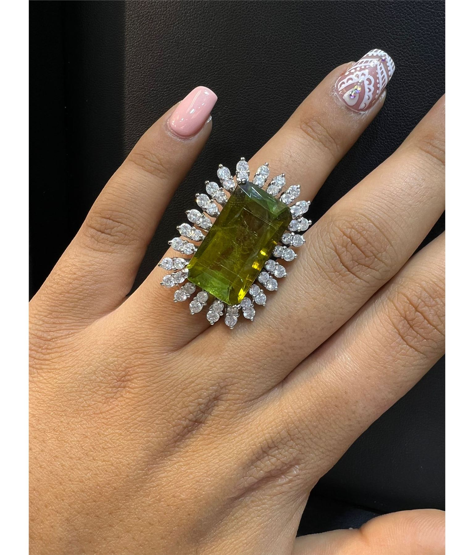 14K W/G NATURAL COPPER BEARING PARAIBA TYPE TOURMALINE RING :10.18GRAM /COPPER BEARING PARAIBA TYPE TOURMALINE :16.43CT/DIAMOND RD: 2.03CT/#GVR1296 **Ideal for channeling nature's healing power, this remarkable 16.43 carat Emerald cut Paraiba Green Tourmaline demands to be seen. Artfully crafted in 14k white gold and surrounded by a sparkling burst of 2.03 carat round cut Diamonds, it twinkles with delight for all to behold, invoking images of timeless glamour and elegance. this gorgeous ring is an investment piece and secure purchase, sure to last a lifetime.**